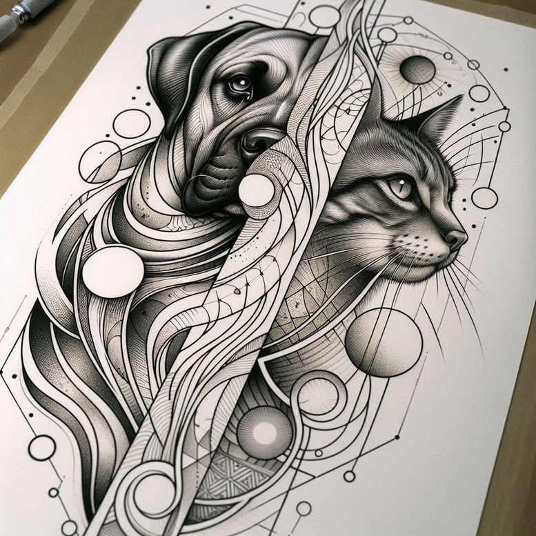 An intricately detailed black-and-grey fine-line tattoo project depicting a dog and a cat merged within a web of geometric circles and interlacing ribbons. The composition balances soft shading on the animals with crisp linework in the surrounding geometry, creating a cohesive piece that reads both as a portrait and as a decorative pattern. The dog’s features—gentle eyes and textured fur—meet the cat’s alert silhouette, framed by circles and arcs that evoke orbital geometry. The shading ranges from smooth gray gradients to dense cross-hatching, giving depth to fur and form while preserving a graphic, tattoo-friendly appearance. The circles and lines act as a modern frame, guiding the eye through the composition and allowing flexible placement on the body. Black ink dominates, with fine points and stippling adding texture; the overall result is a bold, high-contrast design that remains legible at small sizes, making it suitable for a cover-up and adaptable to existing work. This is an AI-generated tattoo project that showcases geometric realism and elegant linework. For collectors of tattoo art, the piece aligns with trends in fine-line tattoo and black and grey realism, while nodding to Japanese-style tattoo motifs and abstract geometry. It can inspire a custom tattoo design focused on meaningful tattoos, animal imagery, and intricate patterning, offering a versatile option for small tattoos, flower tattoos-inspired accents, or larger back-piece projects. The imagery can be interpreted as a celebration of companionship and curiosity, with symbolic ties to infinity, harmony, and the balance between nature and geometry, making it a strong candidate for a lasting body art statement.