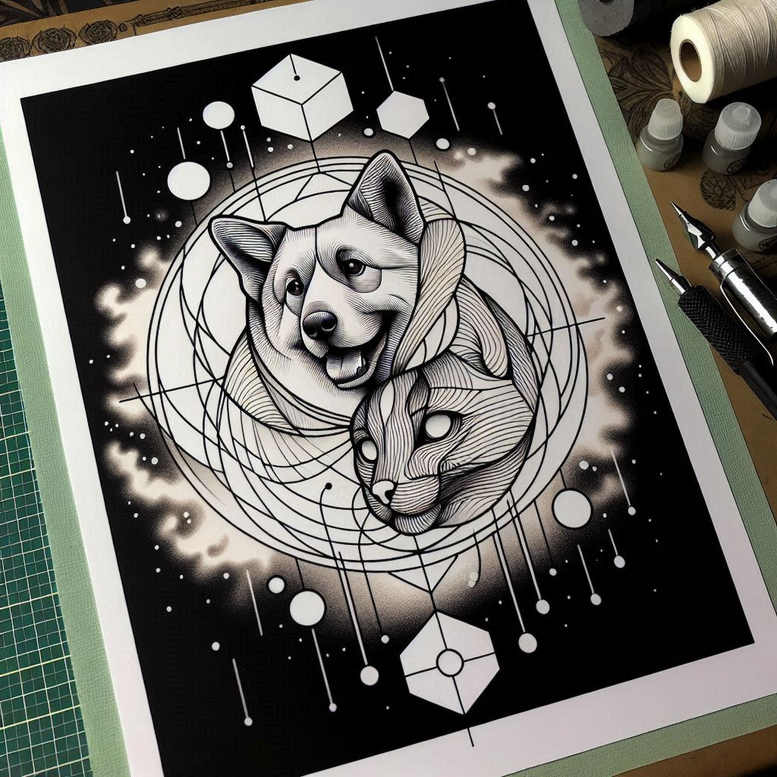 This piece presents a bold black and grey tattoo concept built on crisp fine line technique. At its center, a wolf and a cat share the frame, their heads framed by a web of geometric coordinates and circular rings. The animal forms are rendered with precise line work and subtle shading to capture fur texture and expression, while the surrounding geometry—interlocking circles, angular arcs, and small spheres—creates a hypnotic mandala-like field. Floating cubes punctuate the edges, giving a slight sci-fi, cosmographic vibe that reads as both modern and timeless. The composition relies on contrast between dense black background and white ink, allowing the figures to stand in sharp relief as negative space and line work define depth. Symbolically, the pairing of wolf and cat can signify balance, loyalty, independence, and mystery—qualities well-suited for a personal tattoo narrative or meaningful tattoos portfolio. As a fine line tattoo, the design thrives on clean, uninterrupted lines, measured spacing, and controlled shading to ensure legibility across different body placements, from the upper arm to the shoulder blade. The geometric framework adds a pattern-driven aesthetic that remains contemporary as body art evolves, while the black and grey palette ensures versatility in both small tattoos and larger, statement pieces. For clients seeking a cover-up, the dense negative space and broad black field offer favorable opportunities for concealing prior tattoos, with the white line details guiding new ink placements. This AI-generated tattoo project demonstrates how geometric animal portraits can merge symbolism, technical precision, and commercial appeal, incorporating relevant keywords like tattoo, tattoo design, meaningful tattoos, fine line tattoo, lotus flower tattoo, infinity tattoo, tribal tattoo, rose tattoo design, small tattoos, flower tattoos, custom tattoo design, Japanese style tattoo, black and grey, realistic tattoo, body art, ink.