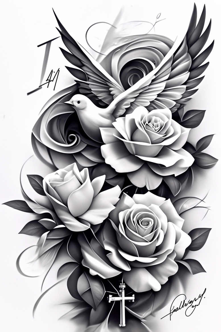 This realistic black and grey tattoo design presents a vertical composition where a dove in flight is entwined with a cascade of roses, with a slender cross settled near the base. Rendered in smooth grayscale shading, the dove’s wings spread and the petals unfurl with careful feathering and petal work, creating a sense of motion and depth. The cross provides a quiet focal point that balances the organic curves of wing, stem, and blossom, making the piece read clearly on the forearm, shoulder blade, or chest depending on placement. The negative space around the central imagery enhances contrast and gives the design a timeless feel, suitable for a cover-up of older ink while honoring personal symbolism. Technically, the tattoo blends fine line detailing with bold black fills and soft gradients, achieving a lifelike texture that remains crisp at small sizes. The arrangement of roses—three blooms interwoven with leaves—creates rhythm and symmetry, while the dove’s silhouette adds airiness and hope. This pattern-rich composition relies on smooth transitions between light and shadow, ensuring legibility across skin tones and aging. The color scheme of black and grey offers versatility for both everyday wear and future personalization, such as initials or dates added later. If a client seeks a meaningful tattoo design capable of concealing previous work, this concept emphasizes cover-up potential without compromising the imagery’s integrity. As an AI-generated tattoo project, it demonstrates how a classic motif can be refreshed with modern shading and composition, yielding a refined piece suitable for small to mid-sized body art, and aligning with keywords like tattoo, tattoo design, rose tattoo design, black and grey, realistic tattoo, and ink.