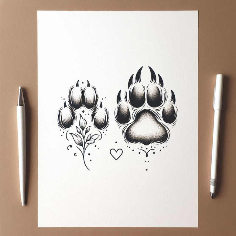This AI-generated tattoo project presents a balanced composition of two paw prints paired with a slender botanical sprig and a small heart, rendered in black and grey with careful stipple shading and clean line work. The larger right paw print anchors the design while the smaller left print offers intimacy of scale, with the plant motif weaving between them to suggest growth, loyalty, and affection. The heart acts as a simple focal point that unites the natural and animal elements, creating a cohesive narrative suitable for a meaningful tattoo design. The technique emphasizes fine-line outlines, soft dot shading, and deliberate negative space to preserve clarity on skin, allowing this concept to scale gracefully from tiny wrist pieces to larger forearm installments. As a concept for tattoos, the palette of black and grey ensures longevity and readability over time, while the absence of heavy fill keeps the piece versatile for different skin tones and placement. The concept is presented as an AI-generated tattoo project, offering a precise blueprint capable of being refined by a skilled artist into a custom tattoo design. Its symbolism supports themes of companionship, growth, and love, making it appealing for meaningful tattoos and small tattoo ideas. The composition also lends itself to variation: the plant could be swapped for different botanicals, the heart could be replaced by a small gem or initial, and the paw motif could be adapted into a dog or cat design, all while retaining the crisp line work that characterizes fine-line tattoos. In short, this design is a timeless fusion of nature and animal symbolism, designed to read clearly on skin, adaptable to multiple sizes, and suitable for body art lovers seeking a refined, gentle statement piece.
