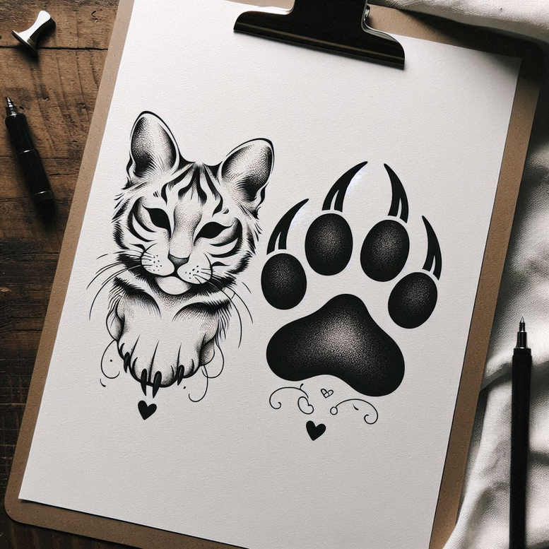 AI-generated tattoo project concept presented as a clean black and grey linework scene featuring a cat head beside a paw print. The design uses fine line technique with restrained shading to evoke fur texture and the rounded pads of the paw, while crisp outlines maintain legibility. Delicate swirls and tiny hearts beneath the paw add a touch of whimsy and balance to the composition. The cat’s calm gaze conveys loyalty and companionship, pairing with the paw to symbolize a cherished pet or personal totem. Rendered in black ink on light skin, the piece relies on negative space to create contrast and readability on small surfaces like the wrist or behind the ankle, and scales gracefully for larger canvases such as the forearm or shoulder. The cat’s facial features are simplified yet expressive, with subtle stippling along the cheeks and brow to suggest fur depth without crowding the image; the paw print uses solid black fill for impact and becomes a focal counterpoint to the cat. This concept invites customization: the cat’s expression can be adjusted, the paw size altered, and motifs added or removed to suit placement and style, from a Japanese-inspired silhouette to a more realistic or stylized interpretation. For collectors of meaningful tattoos, the idea blends classic animal imagery with minimalist linework to deliver a timeless body art piece. Carefully chosen keywords—tattoo, tattoo design, meaningful tattoos, fine line tattoo, lotus flower tattoo, infinity tattoo, tribal tattoo, rose tattoo design, small tattoos, flower tattoos, custom tattoo design, Japanese style tattoo, black and grey, realistic tattoo, body art, ink—anchor the concept to contemporary trends while keeping focus on personal symbolism. The concept demonstrates versatility across skin tones and locations, offering a solid foundation for a bespoke tattoo design that remains legible as a standalone piece or as part of a broader composition.