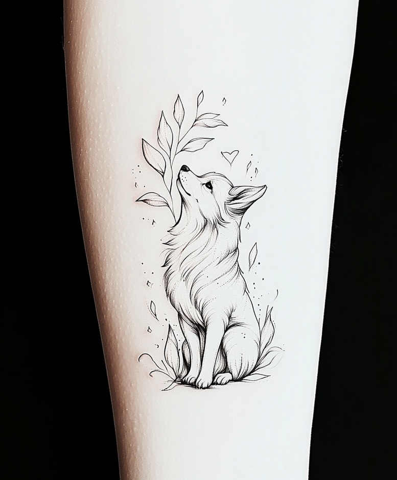 This description accompanies an AI-generated tattoo project featuring a refined fine-line, black-and-grey study of a wolf. The central figure sits in a gentle, upright posture, its head tilted upward as if listening to the forest, while a slender cluster of leaves arcs above and around its neck in a soft, natural frame. A tiny heart hovers near the wolf’s muzzle, adding a subtle emotional layer to the design. The technique relies on precise contour lines and selective negative space, allowing the image to read clearly on an arm-sized canvas with minimal shading. The wolf conveys loyalty, guardianship, and resilience, while the leafy sprig suggests renewal and growth; together they create a narrative suitable for meaningful tattoos or small tattoos that carry personal symbolism. Our line work favors clean, consistent ink flow and a restrained palette—black and grey—ensuring high legibility over time and compatibility with skin tones. As an AI-generated tattoo project, this concept demonstrates how modern tattoo design can balance artistry and practicality, translating a graphic motif into a timeless body art piece. It aligns with contemporary trends in fine line tattoo, black and grey realism-lite, and Japanese-inspired minimalism while remaining accessible to diverse clients seeking a custom tattoo design. The composition is adaptable for a forearm or calf, and its minimalist approach makes it easy to pair with other motifs, such as floral elements or personal emblems, or to be scaled up for a larger piece. Ultimately, this tattoo design embodies serenity and strength in a compact, elegant silhouette that honors traditional ink traditions while embracing digital generation’s precision, making it a compelling option for those pursuing meaningful tattoos. It also serves as a versatile reference for tattoo artists seeking a clean, timeless motif that translates well across sizes and placements.