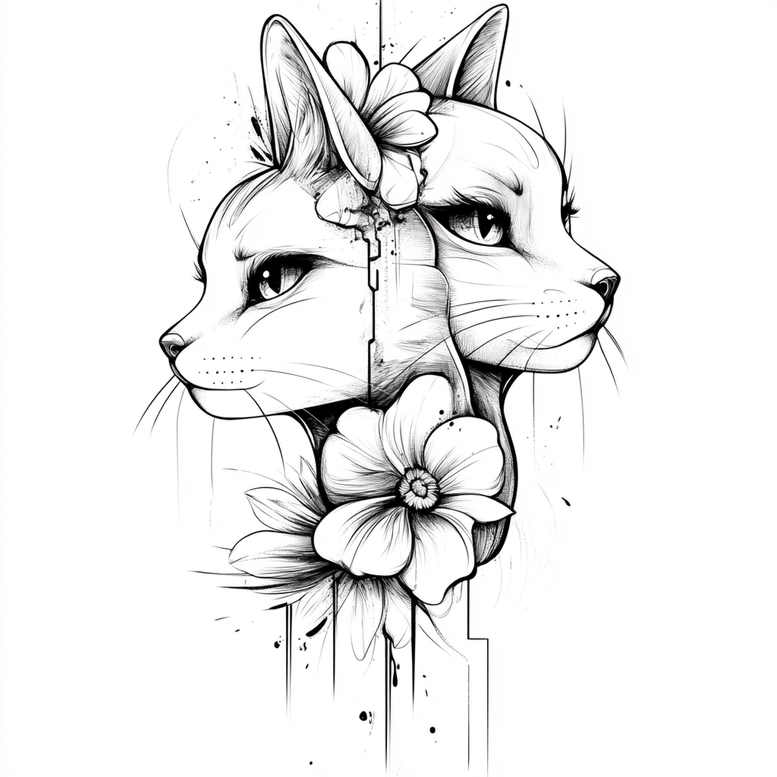 This design presents a refined motif of two cat heads—mirrored profiles—joined by a central blooming flower, rendered in clean black ink with fine-line precision. The composition relies on crisp linework to define the cats’ features, whiskers, and fur texture, while the surrounding blossom provides a soft, organic counterpoint. Subtle splatters and geometric line accents extend from the base of the piece, introducing a controlled graphic pattern that adds movement without overwhelming the main forms. The piece sits comfortably within a black-and-grey palette, promoting strong contrast on light skin and lending itself to small-to-medium placements such as the wrist, forearm, or collarbone. Symbolically, cats evoke independence and curiosity, paired with the flower’s symbolism of growth and resilience to convey a nuanced personal message. The design is well-suited for a cover-up thanks to its bold lines and usable negative space, which can effectively mask older tattoos while preserving a strong silhouette. While this iteration leans toward fine-line aesthetics, it accommodates pattern-like accents that can be enhanced or toned down to suit individual taste. AI-generated tattoo project note: this concept demonstrates how digital sketches can be translated into tattoo-ready line work, maintaining legibility across scales. Key motifs include cat heads, central flower, and ornamental line accents, with potential for light gray wash or shading on request. This piece aligns with contemporary trends in tattoo design for small to medium works and can be adapted into a custom tattoo design to fit unique anatomy and skin tone, appealing to enthusiasts of flower tattoos, cat tattoos, and Japanese-inspired monochrome aesthetics.