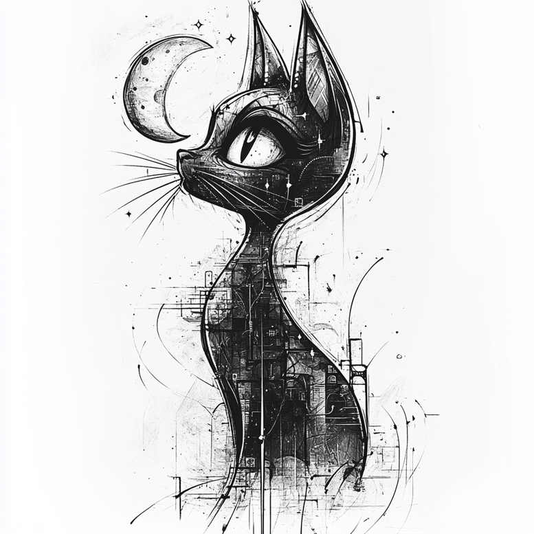 This black-and-grey tattoo concept features a sleek cat silhouette turned in profile toward a crescent moon, rendered in a dense lattice of fine lines and geometric fragments. The composition relies on a balance of negative space and interlocking shapes, producing a graphic, almost architectural quality that reads clearly as a tattoo design at any scale. The cat’s form is built from elongated arcs, rectangular modules, and subtle stippling in the darkest zones to create depth without compromising crisp linework. The crescent moon floating beside the cat anchors the image in nocturnal symbolism, suggesting independence, curiosity, and the cycles of night. Together, these elements form a cohesive motif well-suited for a range of placements, from small tattoos on the wrist to larger back pieces, and the dense patterning ensures a strong silhouette even as ink ages or fades. Because this is an AI-generated tattoo project concept, clients and artists can adapt the pattern density, line weight, and scale to fit skin tone and personal meaning, while preserving the essential vibe of a contemporary, minimalist yet richly detailed design. In terms of style, the piece sits within fine line and black-and-grey tattoo territory, emphasizing legible silhouettes, precise execution, and timeless symbolism. The geometric patterning—an amalgam of straight-edged grids and flowing curves—lends itself to customization, allowing tweaks for a Japanese style tattoo influence, tribal rhythm, or a more photorealistic approach while keeping the overall cohesion. For a broader audience and search optimization, this concept pairs with keywords such as tattoo design, meaningful tattoos, fine line tattoo, cat tattoo, moon tattoo, black and grey ink, geometric pattern, lotus flower tattoo, infinity tattoo, rose tattoo design, small tattoos, and custom tattoo design, ensuring it functions as a versatile blueprint for modern body art. This AI-generated concept invites tattoo artists and clients to explore personal symbolism and scale, making it a practical starting point for commissions that honor both aesthetics and meaning.