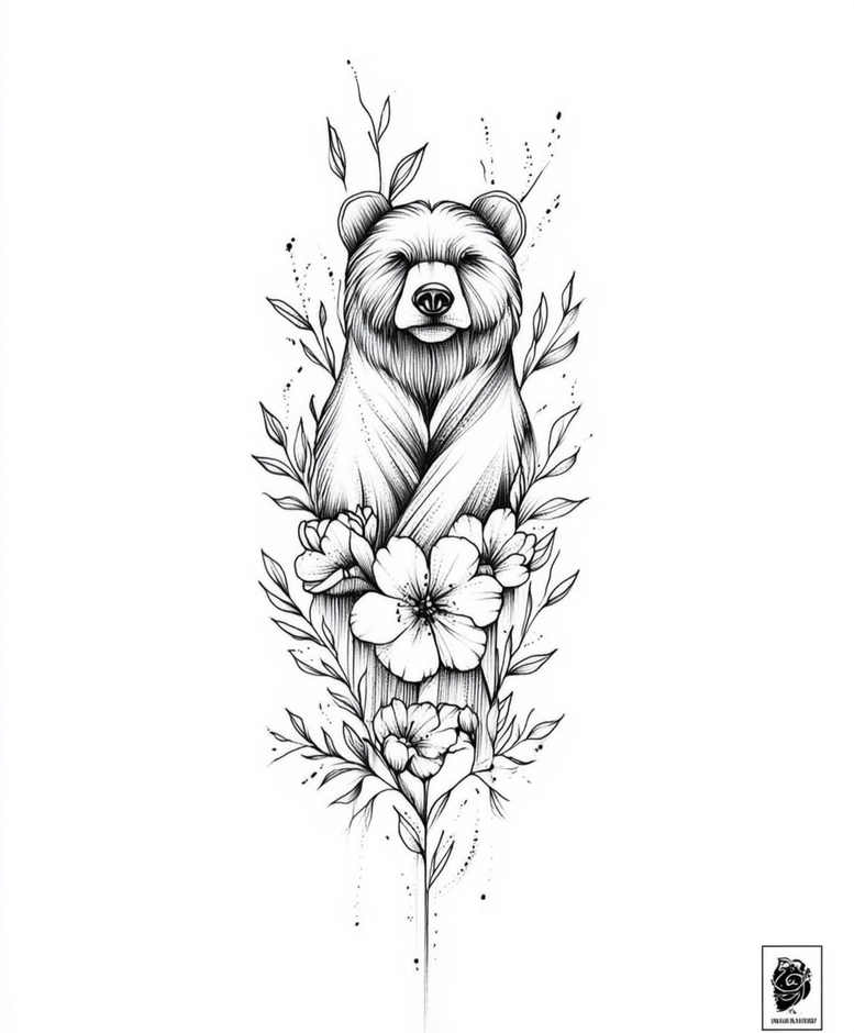 AI-generated tattoo project concept: a graceful panda sits amid a spray of hibiscus flowers and slender leaves, rendered in clean black and grey linework. The composition centers the animal with an aura of calm, while the surrounding blooms create a botanical frame that conveys harmony between creature and nature. The pattern-like repetition of fine lines, stippling, and directional hatching builds texture in the panda’s fur and petals, achieving a sense of movement within a static silhouette. This flexible design scales from a small forearm piece to a larger back or sleeve, and the crisp line density ensures clarity over time. The symbolism blends gentleness and resilience—panda representing peace and balance, flowers signaling growth and renewal—making it a meaningful tattoo design choice for someone seeking a quiet, positive narrative. As an AI-generated tattoo project, it offers a clean blueprint for a custom tattoo design that tattoo artists can adapt to suit individual anatomy and preferences. The black and grey palette anchors the piece in classic realism while the graphic pattern elements give it contemporary edge, compatible with Japanese style tattoo sensibilities as well as floral motif traditions. For those drawn to small tattoos, this motif can be condensed or rearranged without losing identity, while still holding the same symbolism. The overall aesthetic remains timeless, combining naturalistic silhouette with stylized flora to produce a striking body art statement in ink. If color is desired, subtle gradient shading can be introduced to enhance depth, though the piece reads equally well as a monochrome composition. This concept is ideal for collectors of meaningful tattoos who appreciate a harmonious blend of animal and botanical imagery, and its pattern-rich linework ensures a memorable silhouette that stands the test of time. In practice, artists can adapt the pattern density for different placements, and the panda-flower motif can be extended with additional elements like a lotus flower tattoo or infinity tattoo ideas to customize the narrative. The design remains versatile for both realistic tattoo approaches and fine line tattoo aesthetics, reinforcing its potential as a strong portfolio piece for body art and ink enthusiasts.