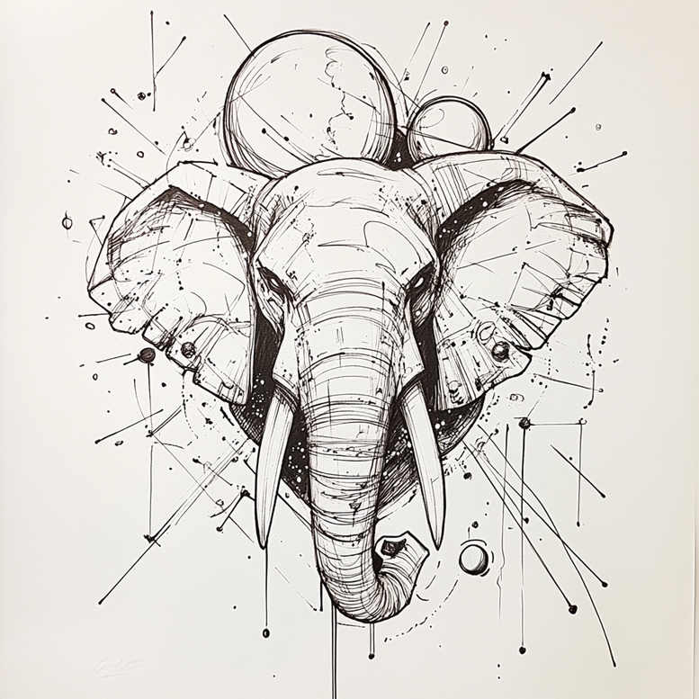 This piece presents an elephant head rendered in precise linework, where organic anatomy meets a geometric framework. The central figure emphasizes the trunk and tusks, with broad ears etched in bold contours, while the surrounding composition explodes into a network of straight lines, nodes, and circular motifs. The result is a modern tattoo design that reads as both a bold graphic and a refined pattern, suitable for a black and grey palette that relies on negative space and varied line weights rather than heavy shading. The image embodies a fusion of fine line tattoo discipline with geometric geometry, delivering a pattern-driven silhouette that is dynamic, readable from a distance, and adaptable to different body placements. The elephant symbolizes wisdom and resilience; the geometric fragments evoke structure, symmetry, and interconnected memory, giving this piece a layered meaning that can be personalized for meaningful tattoos or custom tattoo design projects. For technique, the artist uses clean, confident strokes, strategic spacing, and balanced composition to preserve contrast on skin, ensuring longevity as a tattoo. The surrounding linework suggests motion and energy, with scattered circular motifs acting as orbiting accents that guide the eye toward the center. This concept can scale from small tattoos to large panels, maintaining legibility and impact when inked in black and grey, while offering opportunities for additional detail or shading if desired. As AI-generated tattoo projects, these designs provide a contemporary starting point for clients seeking a distinctive, pattern-rich visage that remains faithful to traditional linework ethics. Whether deployed as a cover-up in cases where prior work exists or used as a standalone focal piece, the clean geometry and bold silhouette support a timeless aesthetic that complements modern body art and ink culture. Keywords include tattoo, tattoo design, meaningful tattoos, fine line tattoo, lotus flower tattoo, infinity tattoo, tribal tattoo, rose tattoo design, small tattoos, flower tattoos, custom tattoo design, Japanese style tattoo, black and grey, realistic tattoo, body art, ink.