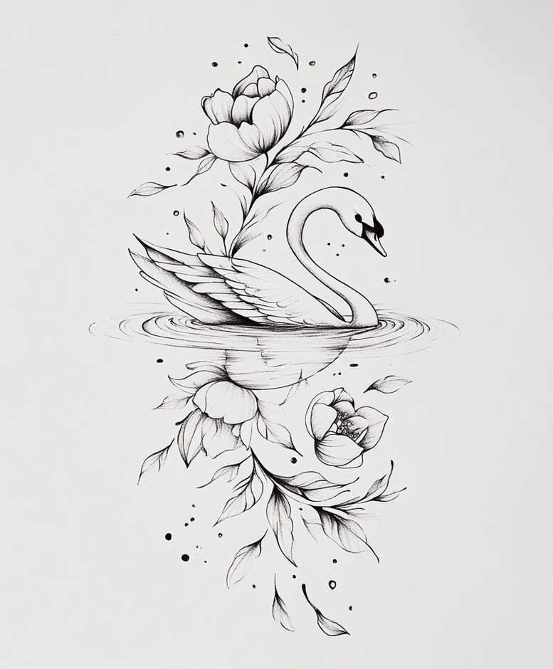 AI-generated tattoo project concept featuring a poised swan gliding on a tranquil pool, its neck arched in a graceful S, surrounded by large blossoms and slender leaves. The line work is precise and clean, executed in black ink with subtle shading to create depth while preserving the delicate quality of fine line tattooing. A calm ripple rings the swan’s reflection, grounding the design in water while leaving generous negative space that enhances legibility on the skin. The floral elements rise along the trajectory of the neck and body, with petals and foliage rendered in smooth, curvilinear strokes that read as a sophisticated blend of nature-inspired symbolism and modern tattoo aesthetics. This composition suits small tattoos and can be expanded into a larger piece, functioning beautifully as a forearm, shoulder, or back subject depending on scaling. The motif encapsulates meanings of grace, transformation, and renewal, pairing the swan with floral accents to convey personal growth and serenity. Technique-wise, the piece relies on crisp contour lines, restrained shading, and light stippling to achieve a black and grey result that remains legible over time. If customized, the florals can be swapped for peony-like blooms or lotus motifs to emphasize purity or resilience, while preserving the overall silhouette. The design nods to Japanese-inspired floral line work and timeless ink aesthetics, offering a refined, realistic vibe that remains versatile for both small tattoos and larger, custom tattoo design projects. This is an AI-generated tattoo project concept, a practical blueprint for tattoo artists seeking to translate elegance into body art and meaningful tattoos, with strong potential for a refined, long-lasting finish.