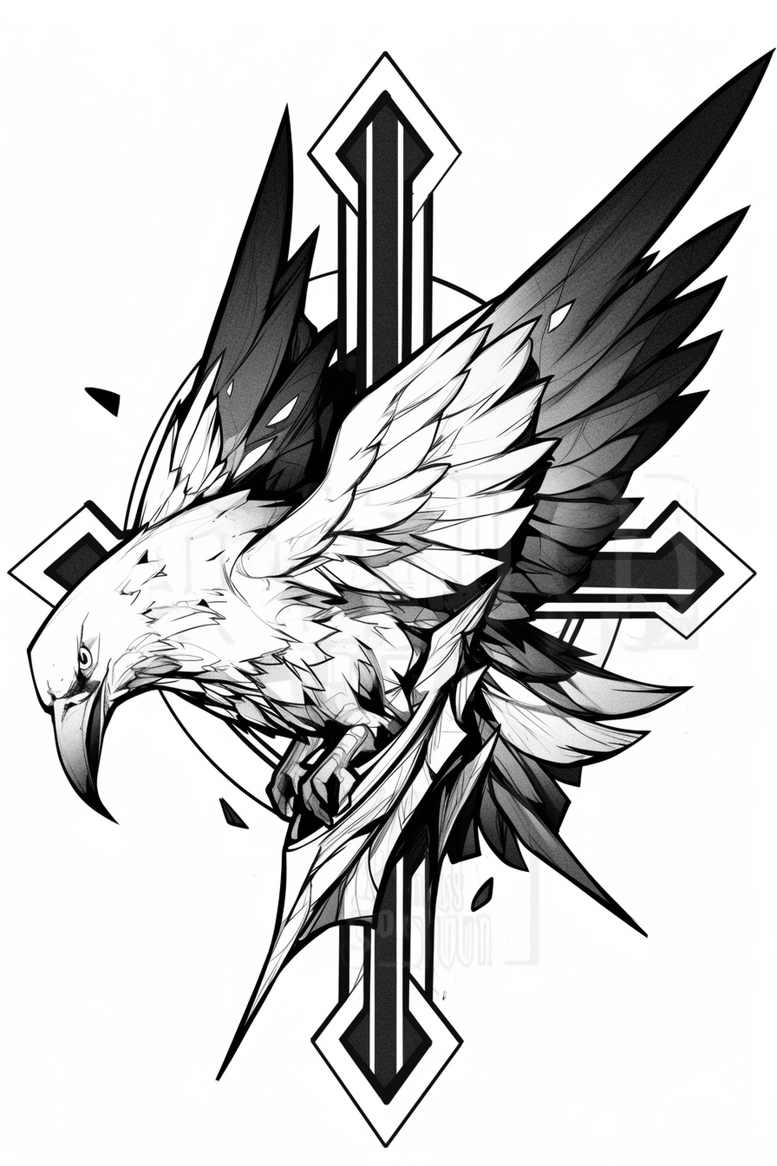 This piece presents a bold black-and-grey linework tattoo design featuring a phoenix in mid-flight, its head bowed and wings spread, intertwined with a vertical geometric cross motif. The composition fuses naturalistic bird anatomy with sharp, angular shapes—diamond frames, elongated spikes and crossbars—that create a dynamic sense of motion and balance. The line weights vary from crisp outlines to soft gradations, establishing depth in the plumage while preserving a graphic, tattoo-friendly contrast. The phoenix, a timeless symbol of rebirth and resilience, is rendered with stylized feathers and a fierce gaze, suggesting renewal through fire and ash. Surrounding elements—geometric diamonds and cross-like bars—provide structure while hinting at spiritual or protective symbolism. Because the image leans toward high contrast and vector-inspired geometry, it translates well as a standalone tattoo design or as a foundation for larger body art projects. The piece demonstrates craftsmanship typical of fine line tattooing with deliberate negative space and bold silhouettes. It also nods to contemporary geometric tattoo traditions that blend classic motifs with graphic art, a trend popular for small tattoos or statement pieces. This is an AI-generated tattoo project intended as a template for collaboration: artists can adapt proportion, scale, and shading to fit a client’s anatomy and skin tone. If desired, the motif can be refined into a cover-up-friendly composition by increasing negative space or shifting the geometric overlay to accommodate existing tattoos. Keywords woven through the text include tattoo, tattoo design, meaningful tattoos, fine line tattoo, lotus flower tattoo, infinity tattoo, tribal tattoo, rose tattoo design, small tattoos, flower tattoos, custom tattoo design, Japanese style tattoo, black and grey, realistic tattoo, body art, ink.