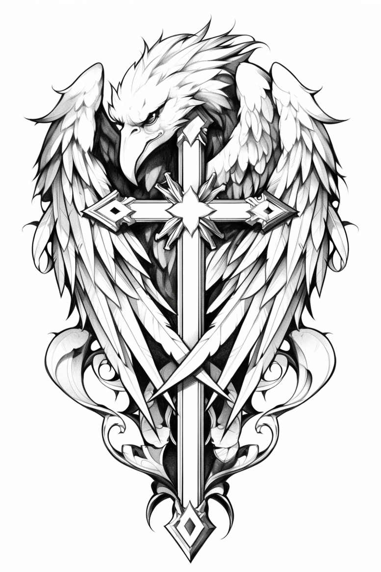 This is an AI-generated tattoo project concept showcasing a symmetrically composed emblem where an eagle’s wings cradle a central cross and razor-edged blade. Executed in pure black and grey linework, the design relies on bold outlines, smooth gradient shading, and crisp geometric accents to create a high-contrast image that reads clearly at tattoo size. The eagle’s plumage is rendered with layered feather motifs that taper into the vertical shaft of the cross, while ornamental scrollwork curls at the base add classical flair and balance. The cross itself functions as a piercing anchor, with a star-like diamond at its core and sharp blades converging to form a protective emblem. This layout supports large-scale placements such as back or chest panels and can be adapted into smaller formats by scaling the elements while preserving legibility. The symbolism blends power, faith, and protection: the eagle as a guardian spirit, the cross as a beacon of belief, and the blade as a symbol of courage and defense. The design borrows from traditional black and grey tattoo aesthetics, rooted in fine-line technique and strong contrast to hold up over time. For clients seeking meaningful tattoos, this concept offers a bold statement with timeless motifs, capable of being translated into a custom tattoo design with precise linework and shading. The included pattern elements—interwoven scrolls and symmetric geometry—provide rhythm and cohesion across the composition, allowing for personalized adjustments in placement, scale, and detail density. As an AI-generated tattoo project concept, it demonstrates how modern tools can inspire enduring body art and serve as a solid starting point for an original commission. In practice, a skilled tattoo artist would refine line weight, adjust shading gradients, and tailor the blade and cross proportions to the client’s anatomy while maintaining the overall silhouette. This piece is especially suitable for a cover-up thanks to its dense negative space and strong focal elements, ensuring it can obscure older art beneath while delivering a striking, legible image that remains true to the intended symbolism in tattoo design, black and grey ink, and linework technique.