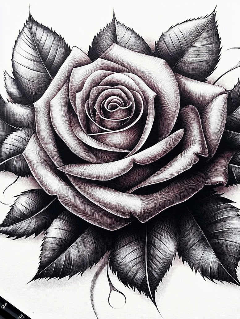 Generated as an AI-generated tattoo project, this piece presents a single, lush rose rendered in fine line black-and-grey shading. The composition centers on a fully opened bloom with tightly coiled inner petals and broad outer layers, accompanied by a spray of serrated leaves that radiate outward to frame the flower. The linework is crisp and precise, while cross-hatching and subtle gradations of tone create a convincing sense of depth and texture typical of a realistic tattoo. The design relies on bold contrast between the darkest shadows and pale highlights to maintain legibility on skin, enabling a strong silhouette at various sizes. Its symmetry and flowing curves lend themselves to placement on the shoulder, upper arm, or back, with the leaves guiding the eye around the central rose. The meaning behind a rose tattoo is timeless: beauty, renewal, and resilience, which resonates whether used as a standalone piece or incorporated into a larger sleeve. For clients seeking a meaningful tattoo design, the fine-line approach preserves detail over time, while the monochrome palette suits black and grey ink aesthetics. This tattoo design also nods to traditional floral motifs with modern refinement, making it suitable for those who appreciate both botanical realism and graphic style. If the goal is a cover-up, the dense shading and dark values provide generous masking potential, helping obscure previous tattoo work while keeping the new rose as the focal subject. The AI-generated origin offers a contemporary take on a classic emblem, fit for a gallery of custom tattoo design ideas and for those exploring small tattoos or larger botanical compositions. Keywords include tattoo, tattoo design, meaningful tattoos, fine line tattoo, lotus flower tattoo, infinity tattoo, tribal tattoo, rose tattoo design, small tattoos, flower tattoos, custom tattoo design, Japanese style tattoo, black and grey, realistic tattoo, body art, ink.