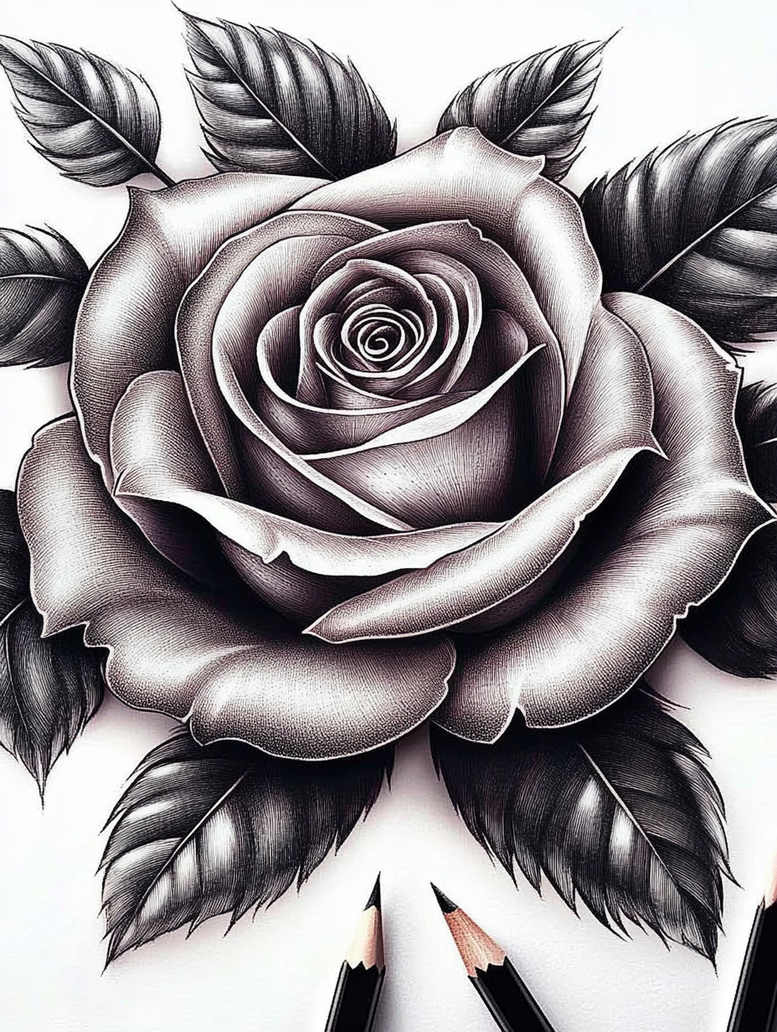 This AI-generated tattoo project presents a sophisticated black and grey, fine-line rose design rendered with meticulous line work and subtle dot shading. The central rose is staged with tightly coiled petals that unfurl outward, with bold, clean outlines softened by gradual shading to create a realistic depth. Surrounding leaves extend along the composition, their serrated edges and light veining contributing a natural, botanical rhythm. At the lower edge, two sharpened pencils rest as if guiding the tattoo from sketch to ink, a meta nod to the design process and creativity. The piece emphasizes contrast between positive white highlights and deep grayscale tones, achieving a sculptural quality reminiscent of traditional black and grey realism. The technique combines fine-line precision with smooth gradient shading to evoke texture—petals appear velvety, leaves have crisp veining, and pencil tips provide a contemporary, meta-art reference. If placed on the body, this design adapts to forearm or shoulder canvases, with the rose serving as a focal point and the leaves guiding the flow along muscle contours. Symbolically, the rose conveys beauty, resilience, and evolving growth, while the pencil motif hints at drafts, revisions, and personal meaning embedded in the ink. As an AI-generated tattoo project, it exemplifies modern approach to custom tattoo design, offering a versatile concept for tattoo lovers seeking a timeless flower motif in a clean, monochrome aesthetic. Keywords such as tattoo, tattoo design, meaningful tattoos, fine line tattoo, lotus flower tattoo, infinity tattoo, tribal tattoo, rose tattoo design, small tattoos, flower tattoos, custom tattoo design, Japanese style tattoo, black and grey, realistic tattoo, body art, ink are woven to reflect contemporary discourse in the field.