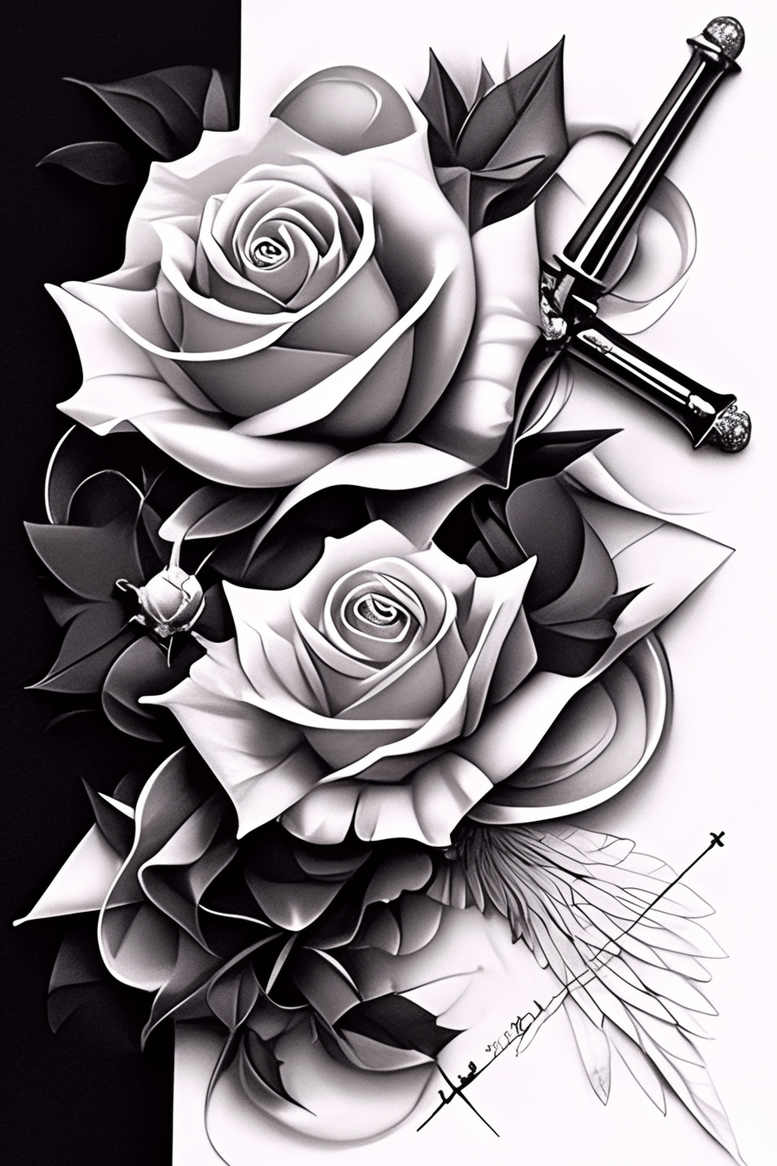 AI-generated tattoo project presents a bold grayscale composition: two blooming roses arranged along a diagonal axis, their petals rendered in meticulous light-and-dark transitions that create a lifelike yet stylized texture. A dagger blade cuts across the bouquet, its polished surfaces catching highlights and casting deep shadows that enhance the piece’s dramatic contrast. Leaves weave between the blossoms, while a delicate wing-like motif or seed-structure emerges near the lower edge, adding a subtle sense of movement and balance. The overall design leverages black and grey shading rather than color to emphasize form, depth, and linework, making it suitable for a large-scale back or chest panel as well as smaller placements. The shading pattern reads as a refined graphic pattern, with careful layering of petals that echo natural forms yet retain a disciplined, tattoo-ready clarity. The juxtaposition of floral softness and angular blade creates a narrative tension: beauty and danger, renewal and permanence. For a cover-up, the dense grayscale areas and sweeping gradients provide ample coverage of underlying ink, while the high-contrast motifs allow for clean line reintegration. The concept integrates classic rose tattoo design motifs with a Japanese-style sensibility of precision and balance, translated into a contemporary black-and-grey, realistic tattoo approach. In terms of symbolism, roses commonly signify love and resilience, while the dagger can symbolize protection or sacrifice, giving the piece personal meaning as a custom tattoo design. This project aligns with trends in fine line tattoo and realistic tattoo renderings, yet remains adaptable to small tatttoos or larger body-art canvases. The work intentionally nods to traditional floral tattoos while exploring modern composition and negative-space tricks that tattoo artists can interpret with needlework precision. AI-origin: This is an AI-generated tattoo project, crafted to showcase cover-up potential and graphic patterning, and to inspire meaningful tattoos like rose tattoo design, small tattoos, and bold black and grey body art.