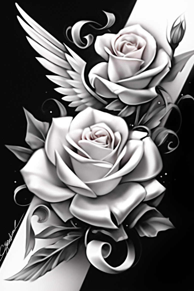 This AI-generated tattoo project presents a dramatic black-and-grey composition featuring two roses, wings, and curling ribbons against a deep, inky background. Executed in a realistic monochrome style, the design relies on smooth gradations of ink to render the petal folds, leaf texture, and feather detail with subtle highlights that catch the light. The central roses symbolize enduring beauty and renewal, while the wings imply ascent, protection, and freedom, creating a narrative of resilience etched in skin. The interplay of negative space around the blossoms heightens contrast and focus, making the design pop on the wearer’s arm, back, or chest. The dark canvas ensures graphic impact and visibility, lending itself to a potent cover-up project for concealing previous work with a dramatic modern twist. Techniques emphasize fine line precision in the petal edges and soft shading in the petals to create a three-dimensional illusion; the leaf veins are refined, and the curling ribbons introduce graceful movement that guides the eye through the composition. In a broader sense, this tattoo design aligns with contemporary black-and-grey aesthetics, appealing to fans of realistic floral imagery, Japanese style influences, and meaningful body art with longevity. The piece can be adapted in scale to fit existing spaces, yet the dense cluster of blossoms and wings ensures a cohesive silhouette even at larger sizes. For collectors and clients, this design offers a cohesive narrative—transformation through beauty, strength and ascent—while staying versatile for customization within a traditional or modern stylization. Given its dark groundwork and high-contrast whites, it remains an ideal cover-up option that can elegantly mask prior tattoos while presenting a fresh, expressive motif. Ultimately, this AI-generated concept demonstrates how modern tattoo design can translate into refined, tattoo design-ready artwork, with potential variations in line weight, shading depth, and scale to suit personal taste and body placement, while remaining suitable for a cover-up if desired.