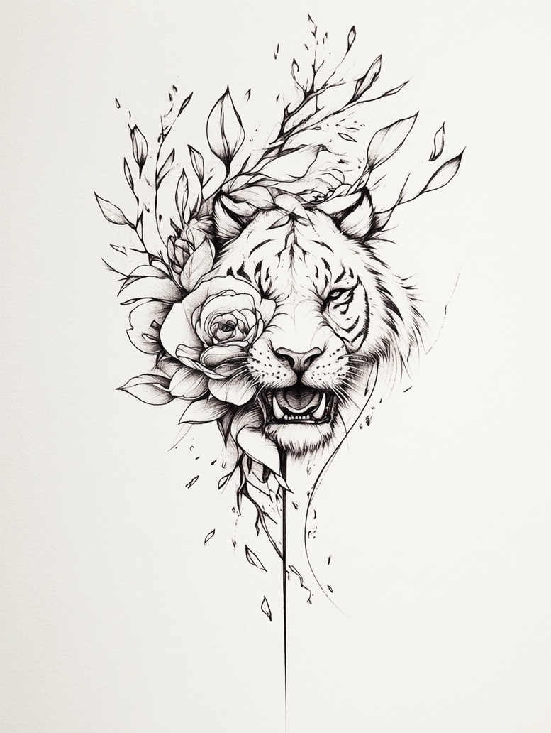AI-generated tattoo concept presents a tiger head rendered in clean black line work, entwined with a rose bloom and curling leaves. The central predator is given expression through precise contours and negative space, while the rose overlaps the snout to fuse ferocity with beauty. Branches weave behind the composition, creating natural framing that guides the eye from the brow down along the jawline. The technique emphasizes fine line tattoo craftsmanship: crisp outlines, delicate cross-hatching for subtle shading, and varied line weight to suggest fur texture and petal depth without heavy fills. The overall effect stays firmly in black and grey aesthetics, preserving clarity and longevity on skin while maintaining an airy, modern feel suitable for both small tats and larger pieces. Symbolically, the tiger stands for courage and guardianship, the rose for love and resilience, and the botanical elements for growth and transformation. This pairing invites interpretation in the realm of meaningful tattoos, offering potential narratives about balance between strength and tenderness. From a design perspective, the piece reads well as a custom tattoo design that can be adapted to placement such as forearm, upper arm, or ribs, with scalable proportions, optional additional floral or fauna elements, and compatibility with Japanese style tattoo influences if the client desires a more Asian sensibility. The monochrome palette makes the work versatile across skin tones and ages gracefully, while the fine-line approach keeps the piece legible over time. As an AI-origin concept, it demonstrates how technology can inform traditional body art while remaining faithful to the expressive possibilities of ink. Artists and clients are drawn to its potential as a small tattoo that carries a strong message, but it also scales well for back or shoulder pieces where the lines can breathe. The design favors clean negative space, which helps conceal minor line blur with age and sun exposure. The image can be revised to integrate a lotus flower motif for additional symbolism or to swap the rose for a peony in a custom tattoo design. The project embraces the current vogue for botanical-tiger hybrids seen in gallery- and studio-produced works, aligning with trends in flower tattoos and animal designs. In sum, this tattoo design merges animal symbolism with floral elegance, delivering a refined, timeless image suitable for ink enthusiasts seeking a meaningful, striking piece.