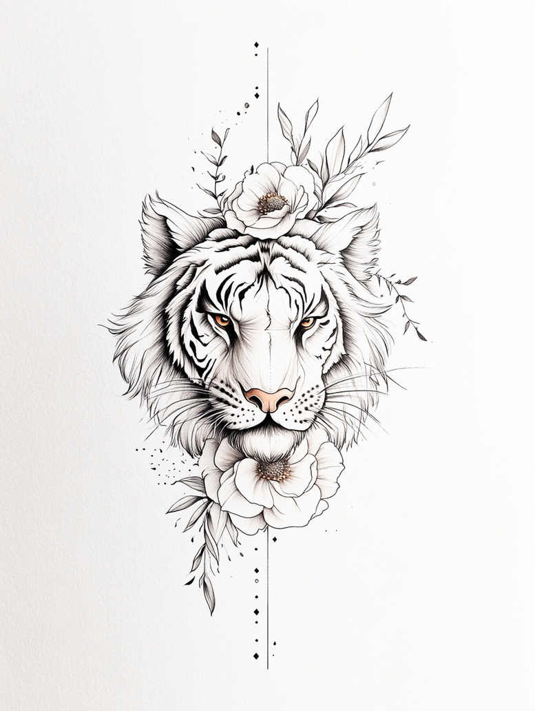 This AI-generated tattoo project presents a refined tiger head enshrined by a botanical crown, rendered in fine line black and grey ink. The composition is split along a slender axis, with a vertical dotted line that threads through the central motif while sculpted petals and foliage emerge from the design. The tiger’s gaze is intense, with amber hints in the eyes to suggest life within the monochrome. The floral elements—two large blossoms, soft petals, and curling leaves—balance the power of the predator, symbolizing harmony between strength and beauty. The linework is precise, featuring delicate hatching and stippling to create depth while maintaining a clean, tattoo-friendly aesthetic. This project leans into a Japanese-inspired sensibility of restraint and naturalism, aligning with trends in fine line and black and grey tattoo art. The concept is suitable as a stand-alone piece or as a meaningful complement to existing body art. It can be adapted to fit small tattoo sizes or be expanded into a larger sleeve, depending on placement. The piece explores themes of courage, resilience, and transformation—the tiger embodies fierceness while the blossoms convey renewal. From a technique perspective, the artist uses crisp linework, soft shading, and intentional negative space to render a lifelike tiger head that remains legible at small scales. The floral crown adds a sense of balance and grace, while the vertical line motif injects a contemporary, geometric rhythm that can function as a guide for future additions. As an AI-generated tattoo project, this concept demonstrates how precise sketching and creative composition can translate into a wearable ink design. If a client seeks meaningful tattoos that blend wildlife realism with botanical elegance, this design offers a versatile starting point: a bold statement piece in black and grey with the option to incorporate color accents, or a refined groundwork for a larger custom tattoo design. It plays well with trends of flower tattoos and animal motifs, and it remains faithful to the essence of body art and ink.