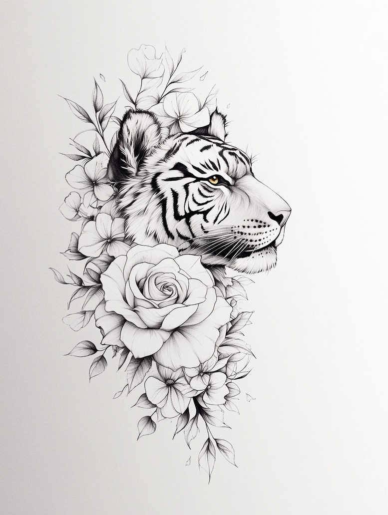 This AI-generated tattoo project presents a refined study: a tiger head in profile entwined with a bouquet of roses and surrounding florals rendered in meticulous black and grey linework. The composition blends the fierce gaze and bold stripes of the tiger with delicate petals, leaves, and slender vines, creating a balance between power and grace. Executed in a fine-line style, the piece relies on clean contour lines, subtle cross-hatching, and soft shading to define form without heavy blocks of shade. The tiger’s fur is rendered with directional strokes that echo natural fur texture, while the roses are built from layered petals that convey depth and fragrance. The surrounding foliage adds movement, guiding the eye from the lower left to the tiger’s snout, and the entire design sits on a vertical axis ideal for forearm, shoulder, or rib placement. This is a project showing a cohesive tattoo design that could be adapted to a larger canvas or adjusted for a smaller sleeve or band. The concept leverages symbolism common in tattoo art: the tiger symbolizes courage, strength, and protection, while roses represent beauty, love, and resilience. The juxtaposition of animal and floral motifs is a classic motif in meaningful tattoos, and the black and grey palette emphasizes form, contrast, and timeless appeal. The piece intentionally references digital artistry to illustrate how AI-generated tattoo projects can inform traditional ink practice, while remaining faithful to the visual language of classic linework. In practice, an artist would interpret the lines and shading to suit skin tone, size, and placement, but the core idea remains: a bold tiger head framed by elegant florals, with pattern-like repetition of linework that suits a fine-line tattoo design. Keywords woven through this description include tattoo, tattoo design, meaningful tattoos, fine line tattoo, lotus flower tattoo, infinity tattoo, tribal tattoo, rose tattoo design, small tattoos, flower tattoos, custom tattoo design, Japanese style tattoo, black and grey, realistic tattoo, body art, ink.