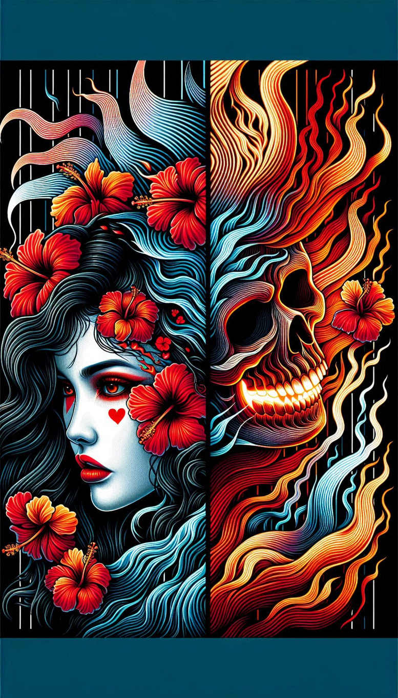 These AI-generated tattoo projects present a bold split-design that merges a blue-toned portrait of a woman on the left with a flaming skull on the right. The left panel centers a calm, porcelain-like face framed by flowing dark hair and bright red hibiscus blossoms, while the right panel reveals a stylized skull surrounded by gradient flames. The color palette uses cool blues and teals for the skin and hair, contrasted by warm reds, pinks, oranges, and yellows in the flowers and fire, all set against a deep black background that amplifies the contrast. A vertical seam separates the halves yet preserves unity, suggesting themes of life and death, beauty and decay, and the transformative power of fire. Graphic patterning appears in the hair, flames, and shading with repeating linear strokes, giving the piece a bold, graphic look that reads clearly on skin and rewards close inspection with texture. Technique emphasizes crisp outlines, controlled gradient transitions, and precise color blocking to yield a refined, magazine-ready tattoo design with strong visual impact. Symbolically, the hibiscus signifies resilience and vitality, while the skull embodies mortality and renewal, intertwined with fire to symbolize passion and transformation. As AI-generated tattoo projects, these renders illustrate how modern digital workflows translate into meaningful tattoos and custom tattoo designs that suit large canvases and cover-up opportunities. The concept invites adaptation by tattoo artists for placement and scale, ensuring legibility at distance and richness in detail on skin across tones, while maintaining the energetic two-panel dynamic that makes this a standout body art piece. Ink quality, line weight, and color saturation would be tailored to individual clients, preserving the bold contrast and symbolic depth that define this design.