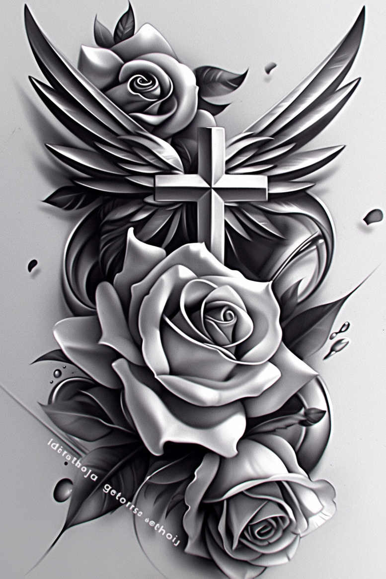 This AI-generated tattoo project presents a bold composition of a cross at the center, wings unfolding behind it, and a cascade of roses curling along the design. Rendered in black and grey, the piece relies on high-contrast shading, smooth gradient transitions, and meticulous edge work to sculpt depth and movement across the skin. The cross is geometric and dimensional, with beveled facets that catch light, while the wings spread outward in layered feather strokes that convey ascent and protection. The roses, rendered in lush petals from outer bloom to inner core, add softness and symbolic resonance: faith and devotion tempered by growth, renewal, and resilience. Leaves and subtle negative space help separate the elements, preventing crowding and ensuring legibility on varied body contours. The composition invites the eye to travel from the central cross to the sweeping petals, then back through the wings, creating a vertical axis that adapts well to forearm, shoulder, or back placements. The design nods to traditional and modern tattoo aesthetics, blending naturalistic floral form with crisp line work and careful shading to achieve a timeless piece of body art. For collectors and clients seeking meaningful tattoos, this concept can be scaled up or down, with adjustable line weight and shading to suit different skin tones while preserving the dramatic silhouette. In technique, the piece demonstrates how black and grey ink layers can convey texture—from the velvety depth of the petals to the metallic gleam of the cross—and how the interplay of light and shadow communicates form without color. Because of its dense composition, the design is particularly well-suited for covering up older, darker ink while keeping readability intact at various sizes. This is an AI-generated tattoo project intended to illustrate a powerful cover-up-ready motif that blends classic symbolism with contemporary shading, inviting customization in scale, placement, and line detail for a personal statement about faith, strength, and transformation.