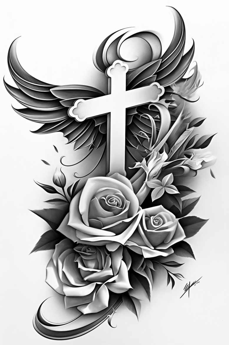 This tattoo design presents a central cross framed by sculpted wings and a bouquet of roses in grayscale. Executed in black and grey with smooth gradient shading, the piece emphasizes contrast between solid geometry of the cross and the organic curves of feathers and petals. The wings extend behind the cross, creating a dynamic vertical composition that flows with the body’s contours. Roses anchor the lower half, their layered petals rendered with subtle highlight shifts to convey depth and realism, while leaves and curling tendrils add movement. The overall effect is bold yet refined, suitable for a cover-up due to its dense shading and high-contrast silhouette that can mask previous tattoos beneath. Techniques include clean linework, layered shading, and careful use of negative space to preserve crisp white highlights. The cross acts as a symbol of faith, protection, and remembrance, while the wings imply ascent or guidance; together with the roses, the piece can express themes of transition, resilience, and enduring love. The composition is versatile for placement on the upper arm, back, or chest, and can be scaled to fit larger canvases or adapted as a smaller piece while retaining readability. For tattoo collectors, this design aligns with black and grey, realistic tattoo aesthetics, and can be integrated into a broader meaningful tattoos portfolio. It also nods to classic tattoo motifs such as rose tattoo design, cross tattoos, and winged icons, while remaining adaptable to a custom tattoo design approach. As an AI-generated tattoo project, the concept can be customized in scale, shading intensity, or added Japanese style tattoo accents if desired, and for those seeking small tattoos or larger body art, it provides a robust template. In the ever-evolving world of ink, this piece marries traditional symbolism with contemporary illustration, offering a timeless option for ink lovers who value craft, detail, and meaning.