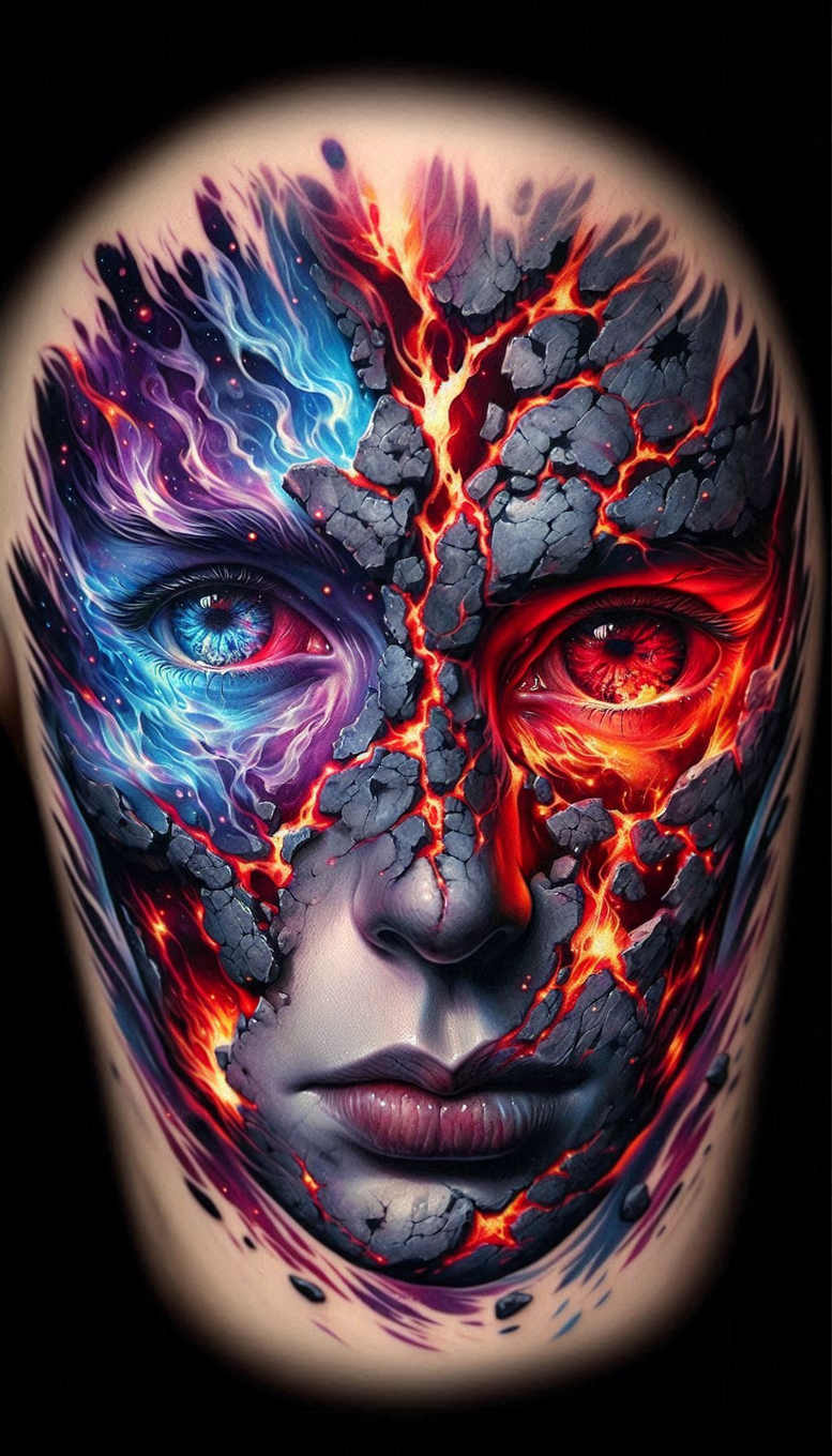 This AI-generated tattoo project presents a striking split-face portrait where opposing forces collide: the left half erupts with electric blue and violet flames, the right half glows with red-orange lava coursing through gray-black fractured rock. The eyes are accentuated—one cool blue, the other fiery crimson—enhancing a sense of duality and inner conflict. The texture imitates volcanic rock, with jagged cracks rendered in luminous tones that bite through the skin, while the outer edges fade into deep black. The technique blends high-detail realism with bold color contrasts, using subtle shading to carve depth in the skin and glossy highlights on the flames and molten rock. The palette pairs cool cobalt and violet with hot reds and oranges, with purple accents tying the composition together. The crack lines traverse the face in a pattern that feels both organic and architectural, suggesting metamorphosis, resilience, and the struggle between opposing impulses. For tattoo enthusiasts, this design offers meaningful symbolism, evoking transformation and balance through contrast. In terms of technique, the piece leans toward realism and fantasy, employing controlled line work around facial features, smooth gradients in skin tones, and crisp edges along the lava fractures to deliver a three-dimensional illusion. While the image is AI-generated, the concept translates readily to a high-impact full-color tattoo suitable for a large canvas, and it can be adapted to smaller tattoos as well. The composition supports a strong cover-up option due to its deep shadows and textured surface that can mask existing ink or scars, with the lava cracks providing bold shapes to align with the wearer’s anatomy. Overall, this modern body art concept embodies current tattoo trends—dynamic, narrative, and intensely visual—making it a compelling choice for someone seeking a custom tattoo design that reads as both art and story, including black and grey influences where shading is practical.