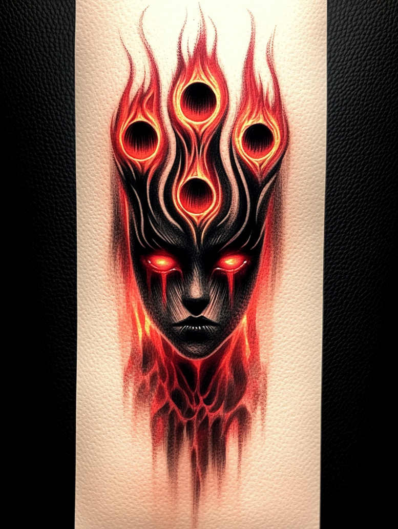 This is an AI-generated tattoo project that presents a dramatic black-and-grey study of fire and visage, centered on a stark, mask-like face rising from a field of stylized flames. The crown of flame, formed by five orb-like fire elements, sits above the brow in a symmetrical, graphic motif; the flames are rendered with crisp linework and bold shading, transitioning from deep black to charcoal and warming through orange and red cores to suggest heat that seems to flicker off the skin. The eyes glow with ember-red intensity, lending an otherworldly presence to a design that feels both menacing and elegant. The lower portion tapers into trailing tendrils that could dissolve into a larger sleeve or torso composition, giving the piece flexibility in placement. The composition relies on high-contrast blackwork, precise outlines, and smooth grey washes to create depth while remaining legible on aging skin. As a cover-up tattoo, the piece uses heavy blacks and deliberate negative space to help mask underlying ink, with the crown of flames providing a strong focal point that can be extended to conceal larger areas if needed. From a technique perspective, the design employs dense block shading, gradient transitions, and meticulous linework to achieve a near-photoreal effect within a bold graphic frame, a hallmark of modern black and grey realism. The imagery invites interpretations around transformation, resilience, and inner fire, aligning with meaningful tattoos and a broader tattoo design vocabulary that spans Japanese style influences and neo-traditional geometry. In the context of AI-generated tattoo projects, this concept demonstrates how digital ideation can be refined into skin-ready art through careful calibration of line weight and placement. For collectors, the contrast of a pronounced face with flame-crowned orbs offers a striking statement piece for forearms, calves, or backs, while its cover-up potential makes it a versatile option for revising prior ink into a cohesive contemporary narrative. Keywords include tattoo, tattoo design, meaningful tattoos, fine line tattoo, lotus flower tattoo, infinity tattoo, tribal tattoo, rose tattoo design, small tattoos, flower tattoos, custom tattoo design, Japanese style tattoo, black and grey, realistic tattoo, body art, ink.