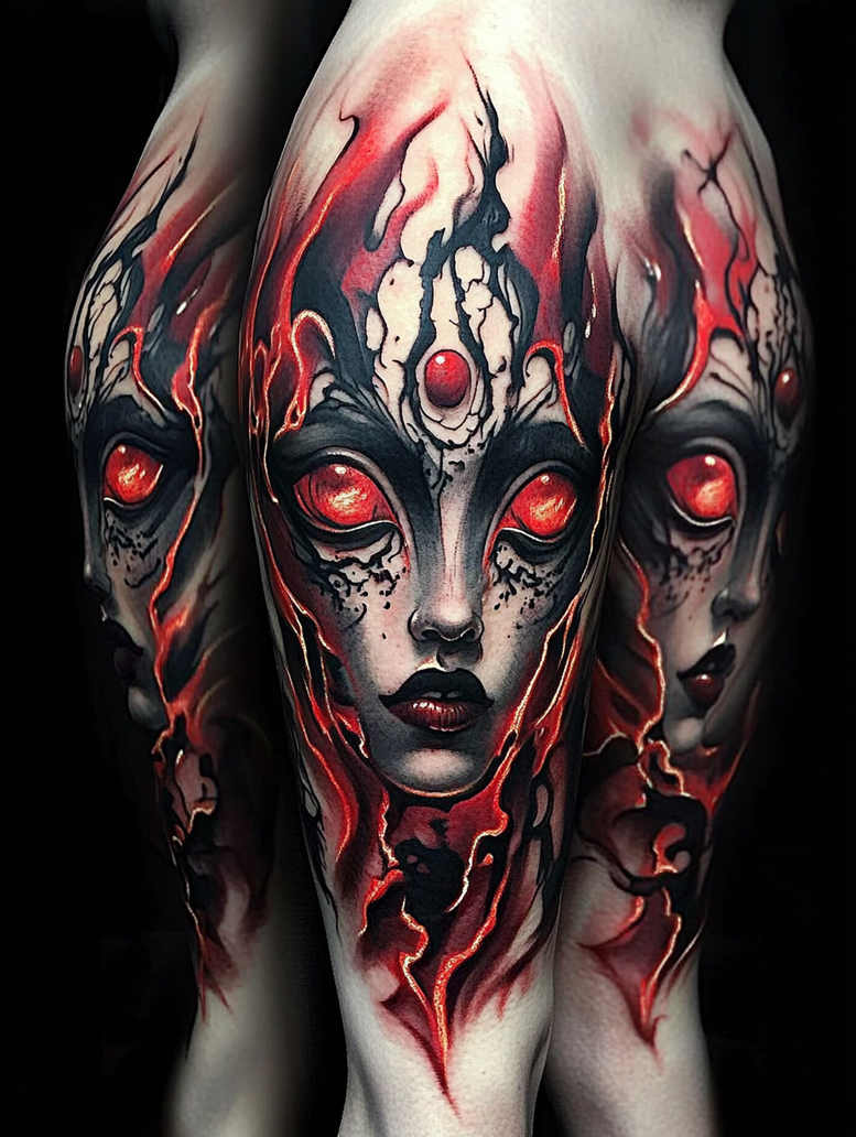 An AI-generated tattoo project concept for a full-sleeve, this piece presents three fiery female faces rendered in black and grey with selective red accents. The central visage dominates the composition, a calm, almost somber expression framed by jagged lava-like fissures that trace the arm’s curvature, while two additional portraits emerge from smoke on either side, their crimson eyes glowing against the grayscale shadows. A circular third-eye motif sits at the forehead, anchoring the design and adding a trace of mysticism. Flame motifs flow between the figures, like molten rivers that weave around the shoulder, elbow, and wrist, creating a dynamic rhythm that suggests movement and energy. The technique relies on bold linework, crisp contrast, and smooth grey gradients to achieve a near-photographic realism while preserving a surreal, fantasy-infused mood. By balancing hard black silhouettes with delicate shading, the tattoo reads as both a narrative scene and a single cohesive body of ink, inviting interpretations tied to power, rebirth, inner fire, and endurance. The color palette—black and grey with red highlights—emphasizes depth and drama, making it a striking choice for meaningful tattoos or for clients seeking a strong, cover-up compatible design where previous ink can be integrated into the lava-like flows. The concept is well-suited for a large-scale sleeve across the upper arm and around the elbow, with careful planning for consistency in line weight and shading to ensure seamless transitions across panels. As an AI-generated tattoo project, it demonstrates how digital concepting can inform traditional tattoo artistry, delivering a bold, cinematic image that aligns with realistic tattoo techniques while embracing a mythic, pattern-rich aesthetic that will resonate with lovers of fine line tattoo, Japanese-inspired drama, and modern body art. Symbolically, the flames denote transformation and resilience, while the faces reference archetypes of gaze and memory, inviting the wearer to confront personal histories and growth. The design also serves as a canvas for future color blossoms or background textures if the client desires.