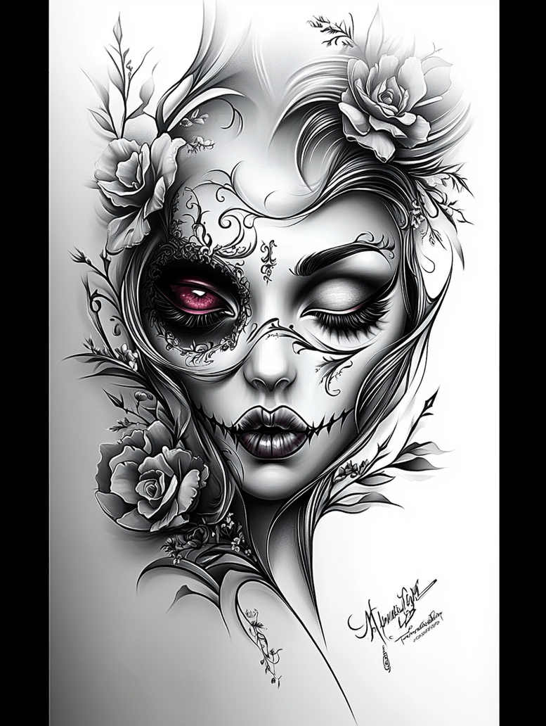 This AI-generated tattoo project concept fuses a sugar skull motif with rose florals in a dramatic black-and-grey palette, presenting a striking portrait where beauty meets mortality. The central face is split by ornamental skull-like detailing on the left, surrounded by intricate filigree and lace-like swirls that weave through the temples and cheeks. Roses anchor the composition—one large bloom near the jaw and a secondary bloom near the lower left—while delicate vines and flowing hair add motion and cohesion. A bold crimson highlight sits in the left eye, providing a focal point that contrasts with the subdued grayscale shading and fine line work that defines the piece. The pattern-like filigree throughout the design enhances depth and texture, creating a cohesive flow that can adapt to a sleeve, back, or chest panel. Symbolically, the juxtaposition of a serene female visage with a skull motif speaks to themes of transformation, memory, and resilience, while the roses symbolize beauty, renewal, and the fragility of life. This tattoo design embraces a modern Dia de los Muertos aesthetic fused with botanical symbolism, offering a versatile option for meaningful tattoos and small tattoos alike. The high-contrast shading and meticulous line work render well in black and grey, ensuring longevity and clarity over time. As an AI-generated tattoo project concept, it invites customization to align with client preferences for placement, scale, and degree of patterning, making it suitable for cover-up scenarios where strong silhouettes and dark shadows can mask previous tattoos while delivering a bold, contemporary body art statement.