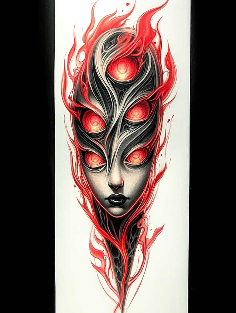 AI-generated tattoo project concept presented for contemporary body-art publications centers on a pale female visage forged in black-and-grey gradients. The sculpture-like face emerges from a lattice of negative space and crisp line work, while red flame-like tendrils wrap around the crown in a dynamic pattern that commands the eye. Five luminous red orbs punctuate the crown and along the silhouette, imparting a supernatural glow that shifts with lighting and skin tone. The composition tightens into a slender neck, drawn with meticulous cross-hatching and smooth shading that yields real dimensionality on the skin. The result is highly graphic and pattern-rich, with interlocking curves and elongated forms that create a bold silhouette when translated to a tattoo. Symbolically, the design suggests transformation, inner energy, and memory—light piercing through shadow—making it a meaningful tattoo design choice for clients seeking personal narratives in ink. Technique-wise, the piece leans into fine-line tattoo aesthetics: delicate lines, restrained grayscale, and subtle gradients that read clearly from a distance while inviting close inspection. The black-and-grey palette is punctuated by hot red accents, delivering a striking contrast adaptable to various placements. Because of its dense blacks and high-contrast geometry, the concept is an excellent cover-up option, capable of concealing older work while delivering a fresh, contemporary look. Although AI-generated, the concept respects traditional tattoo design vocabulary—clear silhouettes, cohesive composition, and a narrative-forward approach suitable for small or large placements, and it aligns with broader categories such as Japanese style tattoo, tribal influences, and realistic tattoo sensibilities while remaining adaptable as a custom tattoo design for flower or face-driven motifs.