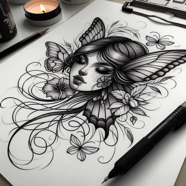 This AI-generated tattoo project is rendered in a precise black-and-grey fine-line style, pairing a serene woman’s portrait with butterfly wings, floral accents, and flowing ornamental swirls. The focal figure is a poised face, rendered with soft shading and refined lines that capture subtle expression while avoiding heavy contrast, allowing the artwork to breathe on light or medium skin tones. Surrounding her, butterfly wings unfold with delicate veining, scales, and a sense of motion created by interwoven negative spaces and skinny stipples, while flowers and tendrils weave through the composition to form a cohesive botanical frame. The technique emphasizes line work and rhythm, with bold contours grounding the piece and fine lines filling in texture, creating a tattoo design that feels both delicate and enduring. The pattern element is especially strong here, with repeated curves, spirals, and lattice-like motifs that repeat across the canvas to give the piece a cohesive, ornamental energy suitable for various placements. Symbolically, the combination of a female visage, butterfly, and blossoms evokes transformation, resilience, and growth, making it a meaningful tattoo choice for those who value metamorphosis and renewal. As an AI-generated concept, this design demonstrates the potential of digital planning to inform a custom tattoo design while offering a clear blueprint for a skilled artist to translate into skin. The black-and-grey palette ensures timeless appeal and compatibility with both small tattoos and larger sleeves, and the piece can be scaled to preserve the integrity of the fine-line technique. If used as a cover-up, the dense linework and pattern-rich elements can help conceal older tattoos with careful shading and placement, depending on existing ink and skin tone; the final result will depend on placement and the tattoo artist’s interpretation. Keywords: tattoo, tattoo design, meaningful tattoos, fine line tattoo, lotus flower tattoo, infinity tattoo, tribal tattoo, rose tattoo design, small tattoos, flower tattoos, custom tattoo design, Japanese style tattoo, black and grey, realistic tattoo, body art, ink.