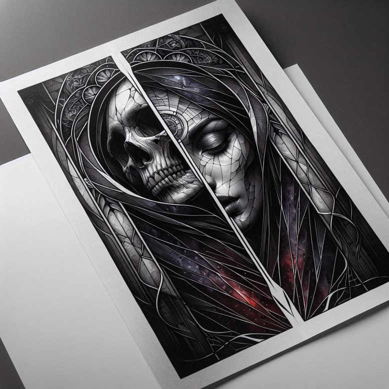 This black and grey, AI-generated tattoo project presents a split-panel composition that pairs a skull on the left with a veiled woman on the right, interwoven by circular mandala-like motifs and a tangle of angular lines that create a sense of movement and depth. The skull is rendered with meticulous shading to evoke bone texture, while the woman’s face remains serene and contemplative, embodying a balance between mortality and mystery. Surrounding geometry relies on fine line technique to weave arcs and intersecting curves, producing a dynamic web that guides the eye through the scene. Subtle galaxy-like pockets of red and indigo peek through the ink, adding cosmic ambiance while preserving the overall black and grey palette. The design is clearly conceived as a cover-up, with dense shading and bold negative space offering a strong canvas to mask existing work while integrating new elements. The panel split enhances symmetry and makes the piece adaptable to areas such as the upper arm, back, or chest, enabling a large-scale, statement tattoo. For tattoo enthusiasts, this concept provides a meaningful design exploring themes of life and death, light and shadow, and the tension between form and abstraction. It invites variations in motif—such as lotus flower tattoo, infinity tattoo, or tribal influences—without losing its core linework integrity. Realization would benefit from fine line precision and black and grey shading to achieve crisp edges and lasting detail. As an AI-generated tattoo project, it serves as a starting point for a custom tattoo design, with room for personalization by adjusting motifs, line density, and color accents to fit individual preferences. Overall, this pattern-heavy, black and grey composition aligns with contemporary body art trends while honoring traditional symbolism, making it an ideal cover-up that transforms prior ink into a renewed, meaningful tattoo design.