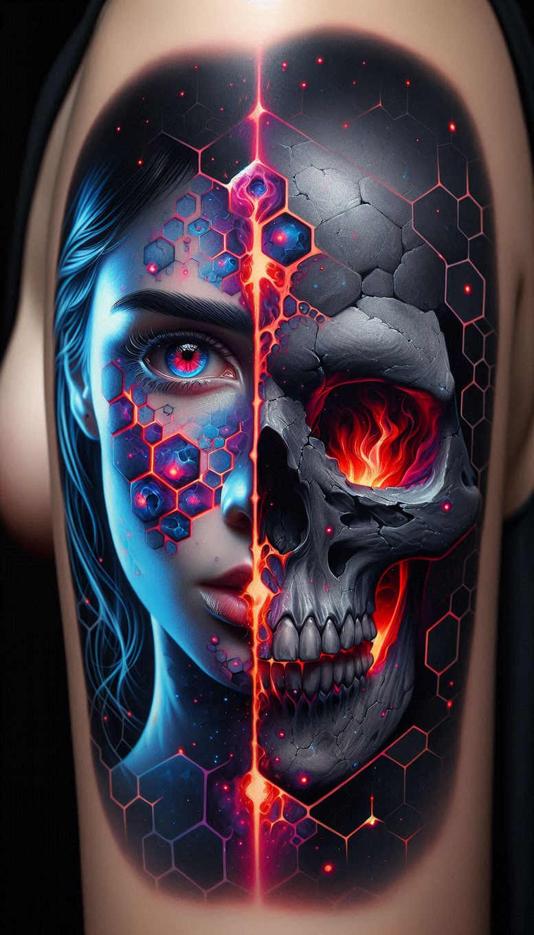 This is an AI-generated tattoo concept that fuses portrait realism with geometric patterning for a bold, cover-up ready project. The composition splits the canvas into two opposing forces: the left side presents a lifelike female face in cool blue and gray tones, its eye rendered with intensity and depth to suggest a focused gaze, while the right side reveals a cracked skull whose interior glows with fiery neon hues, creating a dramatic counterpoint. A vertical neon seam runs down the center, enhancing the sense of duality and guiding the viewer from skin to bone. Overlaying both halves is a hexagon honeycomb grid, rendered with crisp edges and subtle color shifts that evoke cellular structure and cybernetic influence, adding rhythm and a modern edge to the piece. The surrounding shading is predominantly black and grey, establishing deep contrast that makes the neon accents pop and ensures legibility for a large panel or sleeve. Symbolically, the image conveys humanity versus mortality, transformation through fire, and the meeting point of organic and synthetic forms. Technically, it reads as a meticulous translation of digital illustration into ink-ready design: clean line work, smooth gradient shading, and selective color punch that would translate well on skin with careful layering, blending, and aftercare. The hex pattern provides texture and a built-in cover for existing tattoos, offering a natural path for a cover-up while preserving a striking, contemporary look. This concept is AI-origin, intended as a customizable tattoo design suitable for arm or leg placement, and it incorporates SEO-friendly terms like tattoo, tattoo design, meaningful tattoos, fine line tattoo, black and grey realism, and ink to support discoverability, while nodding to related ideas such as lotus flower tattoo, infinity tattoo, tribal tattoo, rose tattoo design, small tattoos, and flower tattoos for broader inspiration.