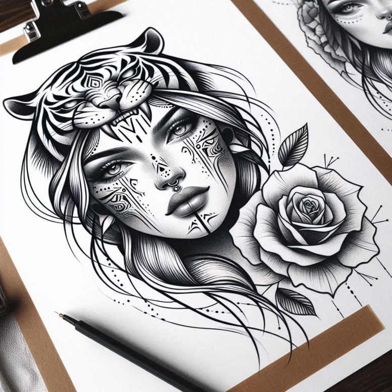 As an AI-generated tattoo project concept, this design explores a sophisticated blend of portrait realism and decorative pattern work in black and grey ink. The composition centers on a woman’s face rendered with fine line precision and subtle shading, while a tiger headpiece crowns the brow, its stripes carved with bold contrasts that maintain a wearable, graphic appeal. To the side, a rose blooms in layered grayscale, anchoring the piece and nodding to classic flower tattoo motifs. Ornamentation in the form of dot-work and intricate line patterns travels across the cheeks and forehead, evoking tribal and Japanese-inspired influences while staying coherent with a modern tattoo design language. The flow of hair arcs around the main elements, guiding the viewer’s eye toward the focal points and adding a sense of movement. A subtle nose ring adds a contemporary edge, balancing tradition with street-style flair. This concept invites tattoo artists to translate digital structure into ink, offering a robust study in pattern integration, portrait accuracy, and decorative motifs suitable for larger canvases or more compact placements. The tiger can symbolize courage and protection, while the rose represents beauty and resilience, creating a narrative of inner strength and renewal. Although presented as a standalone artwork, the piece adapts well to custom tattoo design projects and can be tuned for various sizes while preserving clarity of line work and shading. In terms of placement, the design scales from forearm to back, with the pattern work flowing along curves and natural contours; the bold elements remain legible even at smaller sizes. This tattoo concept is ideal for those seeking meaningful tattoos that combine floral and animal symbolism, and it can be extended toward sleeve or chest panels for a more expansive body art statement. The fusion of black and grey tones, fine-line technique, and pattern-centric composition makes it suitable for those who appreciate both realism and stylized ornament, including lovers of rose tattoo design, tribal tattoo aesthetics, and geometric patterning within tattoo art; as an AI-generated project, it also offers a glimpse into how future collaborations between digital design and ink can shape the landscape of tattoo design.