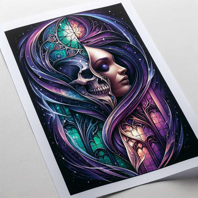 AI-generated tattoo project presented as a bold, color-saturated portrait that fuses life and death in a single composition. The central motif pairs a graceful woman’s profile with a partial skull, rendered in crisp linework within a mosaic of glass-like panels. The hair spirals around the skull and face in ribbons of violet, indigo, and teal, creating motion and depth while guiding the eye through the scene. The background dissolves into a starry night, allowing the figure to pop with luminous highlights and deep shadows. The design relies on graphic patterns and color blocking rather than soft shading, making it exceptionally tattoo-friendly for a cover-up of darker underlayers, camouflaging prior ink while maintaining legibility on skin. The stained glass motif evokes cathedral windows, lending a spiritual undertone and inviting interpretations of rebirth, memory, and transformation. Technically, the piece emphasizes bold contour lines, precise color separations, and clean divisions between glass-like segments to ensure crisp aging and readability on living skin. The portrait-weighted composition balances realism in the face with ornamental geometry, delivering a strong visual read from distance and close up alike. Symbolically, the juxtaposition of feminine grace and skull hints at the coexistence of beauty and mortality, while the star-field backdrop suggests vastness, fate, and the permanence of ink. As an AI-generated concept, it illustrates contemporary tattoo design trends that blend fantasy, patterning, and vibrant color. The palette—predominantly purples and teals with magenta accents—provides high contrast against darker skin tones, allowing the tattoo to function as a standalone piece or as the centerpiece of a larger body of work, such as a sleeve. Residents of tattoo studios seeking meaningful tattoos, fine line tattoos, or custom tattoo design will find this piece particularly compelling. The graphic glass panels and starry backdrop add texture and rhythm, giving this design broader appeal to collectors who value pattern-driven tattoos and bold color. In sum, the image represents a bold, full-color tattoo design with Gothic atmosphere, ready for clients considering a cover-up or a striking standalone work.