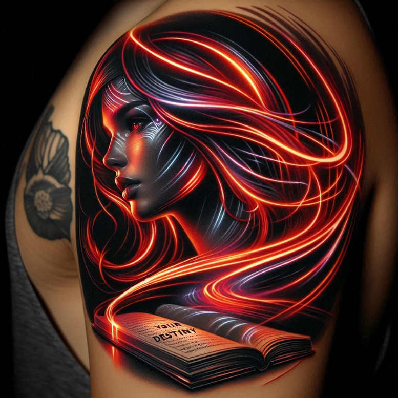 This tattoo design presents a realistic portrait of a woman on dark skin, her profile bathed in neon red and electric blue light trails that flow from the hair into an open book resting near the lower ribs. The composition fuses portrait realism with graphic patterning: bright, continuous lines create motion and energy, while subtle shading around the face adds depth and realism. The open book displays the words YOUR DESTINY, anchoring a narrative about fate, choices, and empowerment. As an AI-generated tattoo project, it demonstrates how digital design can translate into bold ink with high contrast and cinematic mood. The piece is highly suitable for a cover-up thanks to its luminous lines set against a dark canvas, and it can be executed in full color or reinterpreted in black and grey with a careful grey wash. Visible elements include a woman, hair, neon lines, and an open book; the neon curves function as both highlights and pattern, giving the tattoo a distinct, pattern-rich look. This design suits meaningful tattoos and contemporary body art, offering potential for fine line tattoo detailing around facial features and flowing lines that could nod to Japanese style tattoo or modern tribal rhythm. The concept is adaptable: it can be placed on the shoulder, sleeve, or torso, scaled for small tattoos or large formats, while preserving the readability of the destiny motif. Because the background is very dark, the cover-up potential is a central advantage: bold portraiture and bright neon can effectively mask prior work, producing a fresh narrative of destiny and self-determination. This is an AI-generated tattoo project intended to push the boundaries of realism and graphic neon, delivering a striking tattoo design suitable for portfolios and galleries, while aligning with tattoo design keywords like meaningful tattoos, fine line tattoo, lotus flower tattoo, infinity tattoo, tribal tattoo, rose tattoo design, small tattoos, flower tattoos, custom tattoo design, Japanese style tattoo, black and grey, realistic tattoo, body art, and ink.