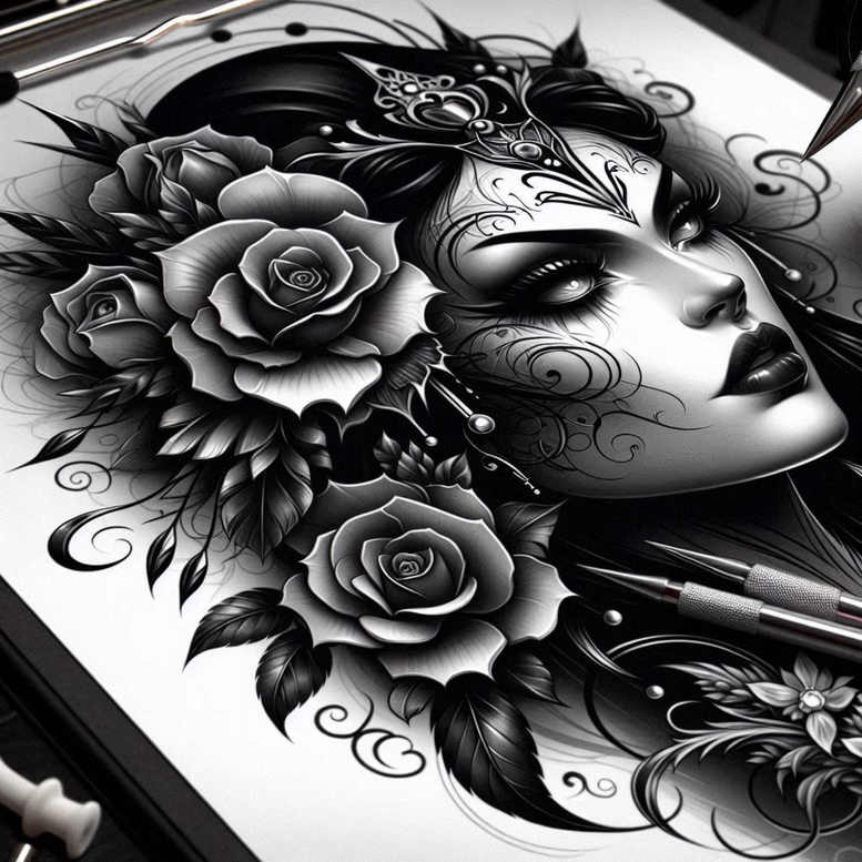 AI-generated tattoo project: a dramatic black-and-grey rose crown portrait that blends realistic shading with ornamental filigree. This tattoo design centers on a woman’s face in profile, her gaze calm and enigmatic, framed by a cascade of roses and curling leaves that weave into delicate arabesque patterns. The piece relies on soft gradients of black ink and scatter of midtones to create a lifelike depth, with crisp linework defining petals, thorns, and filigree tendrils. The rose motifs symbolize beauty, resilience, and transformation, while the intricate filigree implies a sense of mystery and personal narrative. Executed in a realistic black-and-grey style, the design emphasizes contrast between solid blacks and smooth gray washes to achieve a photo-realistic appearance on the skin. This is a substantial cover-up-ready concept, with dense darkness and large negative spaces that can mask earlier tattoos while maintaining a striking central silhouette. The composition balances portraiture with botanical elements: the face provides the anchor, the roses deliver volume and scent of life, and the ornamental pattern connects foreground to background with swirling lines that echo traditional Japanese and European ornamental tattoo motifs. The technique favors smooth shading, feathered gradients, and precise line work to ensure readability from a distance and clarity up close. For tattoo lovers seeking meaningful tattoos, this piece offers rich symbolism and aesthetic versatility: it can be scaled for a forearm or shoulder panel, adjusted to suit a client’s skin tone, and customized into a personalized narrative. Widely applicable in modern ink culture, the design aligns with trends in black and grey realism, fine line detailing, and botanical tattoos, while keeping a nod to classic flower tattoos and crown motifs. As an AI-generated tattoo project, this concept demonstrates how digital ideation can translate into a bold body art piece that remains timeless, elegant, and versatile. If the client aims for a dense, cover-up friendly canvas, this composition excels by leveraging heavy shadow blocks and floral density to obscure underlying marks, making it an ideal starting point for a custom tattoo design that resonates with personal meaning and visual impact.
