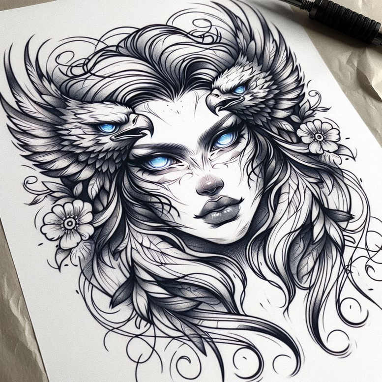 This AI-generated tattoo project presents a sophisticated black-and-grey fine-line composition centered on a serene woman’s face, flanked by two stylized eagles whose eyes catch the viewer. Crisp linework builds the contour of the face, while varying weights create depth and a sense of movement, aided by subtle shading that suggests volume in the nose, lips, and cheeks. Floral elements weave through the hair and around the frame, providing a natural counterbalance to the architectural precision of the birds and the softness of the facial features. The grayscale palette relies on conscientious cross-hatching and stippling to evoke light and shadow without overwhelming the design, preserving readability on skin and ensuring longevity as a tattoo design. Symbolically, the central visage can denote inner strength, grace, and resilience, while the twin eagles imply protection, courage, and duality—an invitation to interpret personal mythology through ink. The composition lends itself to placement as a standalone piece on the forearm, upper arm, back shoulder, or chest, with enough negative space to breathe and for future expansion into a sleeve if desired. The pattern-like rhythm of spirals and floral petals intensifies the visual flow, aligning with contemporary tattoo discipline while nodding to traditional linework motifs seen in Japanese style tattoo and tribal tattoo traditions. Practically, the piece demonstrates how fine line, black and grey ink can achieve a bold portrait with delicate texture, suitable for meaningful tattoos, custom tattoo design, and even small tattoos for those seeking a refined expression of body art. This project showcases current AI-assisted tattoo craft, offering a template adaptable to different skin tones and placements, while preserving its elegant balance of form and meaning. The artwork invites interpretation and can be used as a versatile starting point for larger compositions or recolored into a more vivid palette if desired.