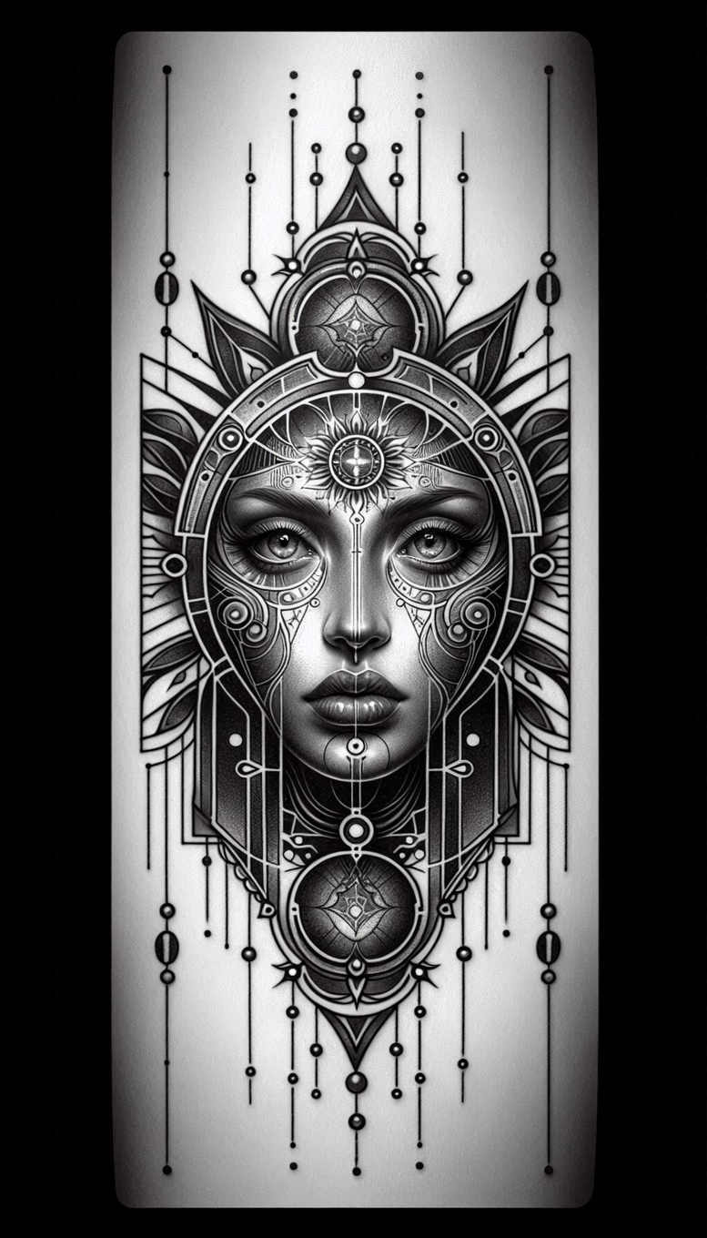 AI-generated tattoo project concept presented here features a front-facing female visage framed by an ornate mandala headpiece and Art Deco–influenced geometry. Executed in black and grey with a fine-line technique, the design relies on crisp line work, soft gray shading, and restrained contrast to ensure longevity on the skin. The central face carries lifelike nuance: subtle highlights on the lips and the bridge of the nose, while the eyes are rendered with reflective detail, giving a sense of gaze and intent. Encircling the portrait, a layered mandala and segmented arcs create a halo that extends into vertical strands and dotted tracery, suggesting a suspended network of light and energy. Each element—circles, spokes, arches, and delicate filigree—serves both aesthetic and symbolic purposes: the mandala stands for wholeness and focus; the vertical lines evoke ascent or connectivity; the circular devices echo timeless mechanisms found in sacred geometry. The design works well as a stand-alone tattoo or as a cover-up, because the density of the lines can be leveraged to mask older ink while establishing a bold new focal center. This tattoo design emphasizes craftsmanship in line density, negative space, and gradient shading so that it retains legibility across sizes, from small wrist pieces to larger back panels. Given its intricate patterning, the piece also lends itself to customization—altering the headpiece, adjusting the mandala complexity, or adapting the motifs to suit Japanese-style or modern graphic sensibilities. Created as an AI-generated tattoo project, it illustrates how digital artistry can inform real-world body art, offering a meaningful tattoo concept anchored in black and grey realism, but adaptable to various styles including fine-line, pattern-driven, and custom tattoo design fantasies.