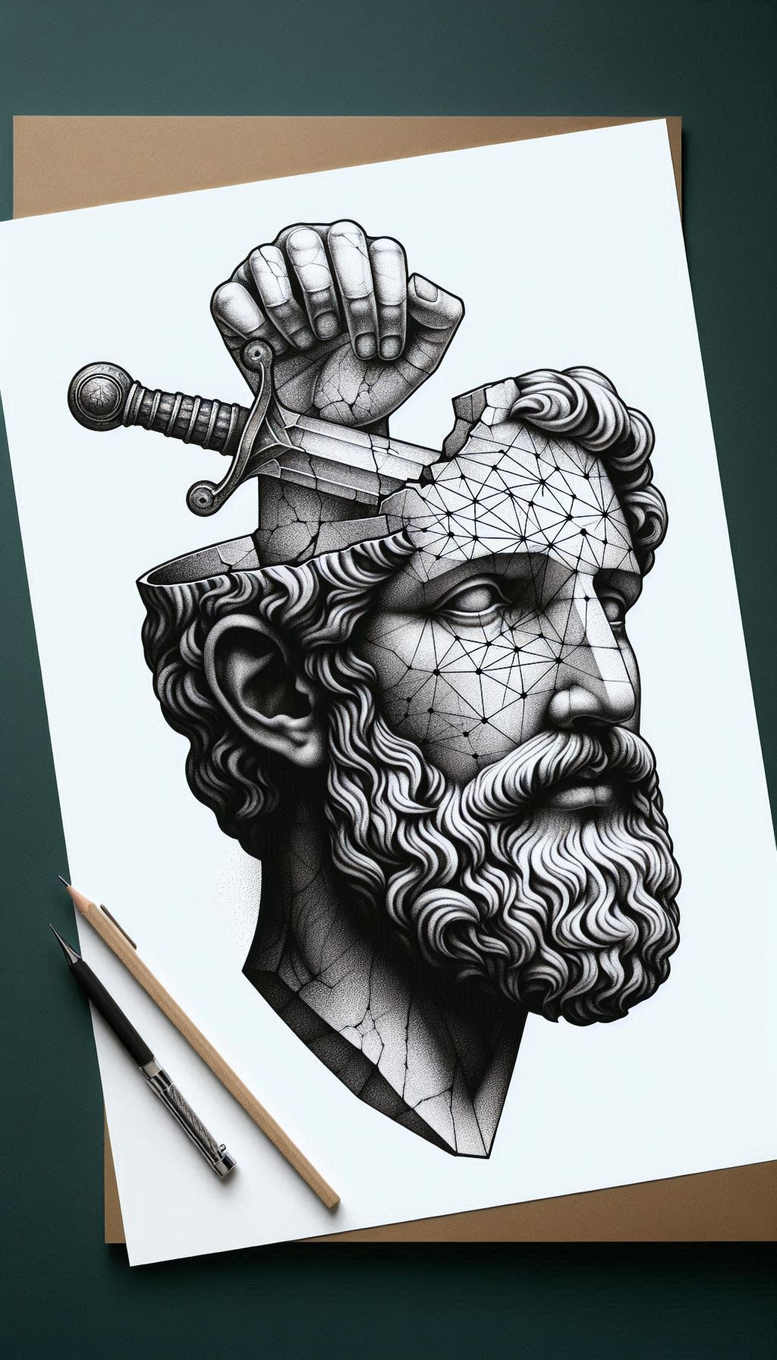 An AI-generated tattoo project that fuses classical sculpture with contemporary geometry. The central image is a Greek statue head rendered in black and grey with a sword thrust through the crown, a bold contrast against the white background. A network of polygon paths crosses the forehead and temple, creating a faceted mesh that gradually dissolves into realistic shading on the hair, beard, and neck crack lines. The technique blends crisp linework for the polygonal lattice with smooth grayscale gradients to convey three-dimensional volume, using stippling and cross-hatching to render texture in the hair and beard. The sword’s hilt and guard provide a mechanical counterpoint to the antiquity of the statue, suggesting themes of conflict between tradition and modernity, resilience, and transformation. The composition is designed for ink placement on the upper head and jawline, with negative space that allows clean edges for cover-up work if needed. In symbolic terms, the piece evokes wisdom and authority of the ancient world while representing the fragmentation and reconstruction of identity through digital motifs. It is a bold, high-contrast tattoo design that translates well to both small and large sizes, offering flexibility for placement on the arm, chest, or back. As an AI-generated tattoo project, it showcases how algorithmic artistry can produce meaningful tattoos that merge aesthetic purity with narrative depth. Keywords embedded include tattoo, tattoo design, meaningful tattoos, fine line tattoo, black and grey, realistic tattoo, custom tattoo design, and geometric pattern, with broader calls to body art and ink. This concept invites refinement for a client’s preferences, yet preserves its core meaning and visual punch, making it a strong candidate for a cover-up if desired.