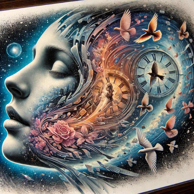 An expansive, color-rich tattoo design that blends portrait realism with timekeeping imagery and botanical motifs. The central element is a serene profile of a woman’s face rendered in blue-black shading with subtle skin-toned highlights, its contour dissolving into a stream of gears, clock faces, and flowing filigree. The design uses vivid pinks for rose blossoms and crisp whites for flying birds, set against a deep space-like gradient that shifts from cobalt to amber around the temple and jawline. The mechanical swirls echo the passage of time, inviting interpretation of memory, transformation, and renewal, while the floral elements symbolize growth and beauty that endure beyond change. Each clock dial carries Roman numerals and minute markers, and their circular motifs are threaded through leaves and petals to create a continuous pattern that guides the eye from the forehead down along the neck in a natural cadence. The artist employs a refined blend of shading, stippling, and crisp linework to achieve a photo-realistic feel within a tattoo context, ensuring smooth skin tones meet the complexity of the machinery without losing legibility as the piece wraps across a shoulder or chest panel. This is an AI-generated tattoo project that leans toward a graphic, pattern-dense composition, suited for large areas or as a centerpiece piece, with potential for a dramatic sleeve or chest tattoo depending on placement. The symbolism resonates with time, fate, and renewal, making it a meaningful choice for anyone seeking a tattoo design that blends elegance with kinetic storytelling. From a technical standpoint, the contrast between the soft gradations of blue and gray and the sharp contrast of the gears and birds demonstrates masterful color balancing, negative space, and layered textures. The pattern elements are deliberate, creating a rhythmic flow that echoes infinity tattoos and floral motifs while remaining distinctly original. This description foregrounds the tattoo as a meticulously crafted high-detail design that invites close inspection, making it appealing to fans of fine line techniques and full-color realism alike, and aligning with keywords like tattoo, tattoo design, meaningful tattoos, fine line tattoo, lotus flower tattoo, infinity tattoo, tribal tattoo, rose tattoo design, small tattoos, flower tattoos, custom tattoo design, Japanese style tattoo, black and grey, realistic tattoo, body art, and ink.
