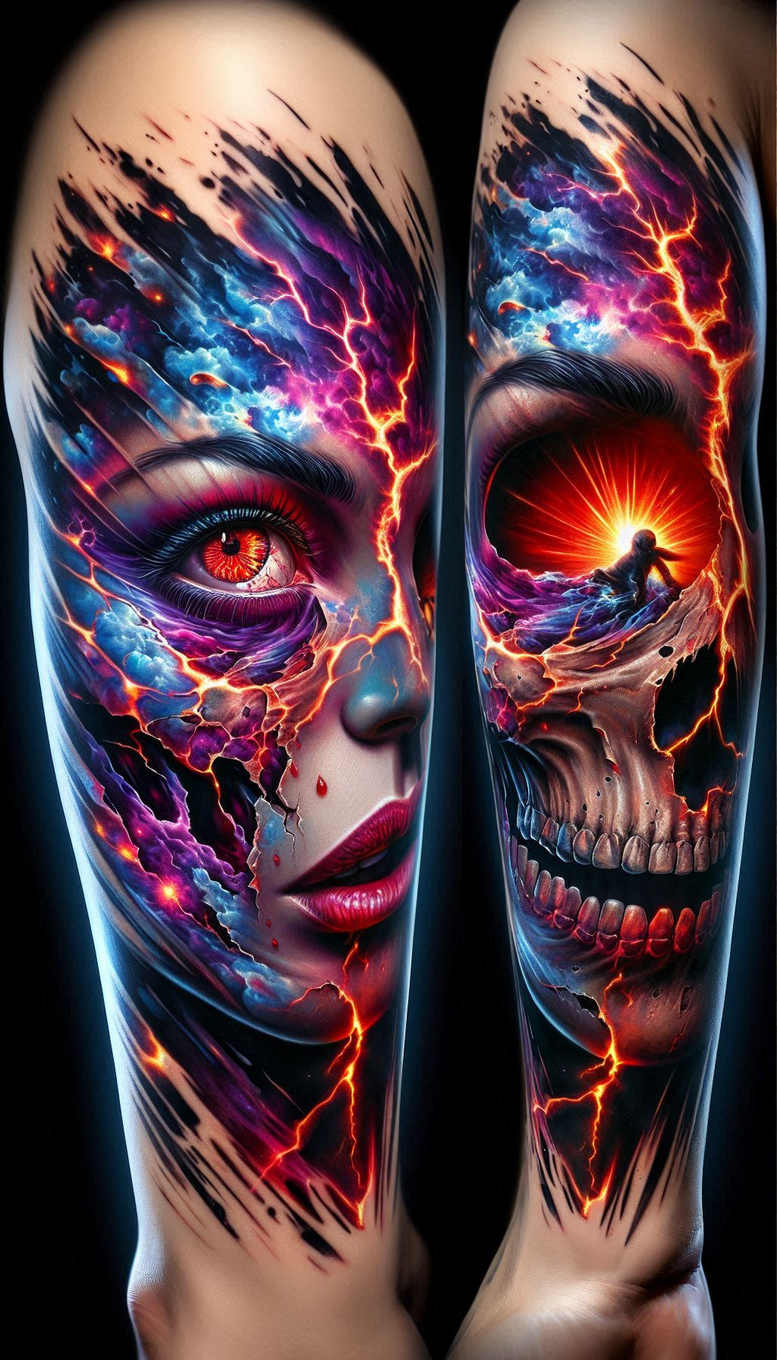 An AI-generated tattoo project presented as a high-contrast, color-rich dual-portrait design that merges a feminine profile on the left with a skeletal visage on the right. The left panel centers a detailed female face with a luminous red eye, glossy lips, and flowing, fractured color blocks that bleed into the right side. The right panel reveals a skull framed by jagged lightning bolts and a molten sunset, creating dramatic tension between life and death and giving the impression of energy coursing through the skin. The composition is driven by a bold pattern language: sharp fissures, electric streaks, and repeated motifs that create rhythm across a long forearm canvas. The palette leans into electric blues, magentas, purples, and scorching oranges, with tight black ink for depth and high-contrast edges to keep readability from a distance. Technique-wise the artist uses smooth gradient shading, fine-line detailing for the eye and teeth, hard edges for lightning, and strategic color blocking to ensure both legibility and intricate up close. The symbolism speaks to duality, transformation, and resilience; lightning can signify sudden insight or rupture, while the sunset hints at endings and renewal. The piece is designed as a strong statement tattoo design for those seeking a meaningful narrative work, and its cover-up potential is substantial: dense black shadows and layered patterns allow older ink to be camouflaged while providing a fresh, cohesive focal point. This example demonstrates how AI-generated tattoo projects can translate complex ideas into wearable body art, offering a roadmap for collaborations between digital concepts and traditional tattoo techniques; it sits within the realm of realistic tattoo, with black and grey potential in some areas, but here it thrives in full color, celebrated as ink, body art, and storytelling. In sum, this pattern-rich, full-color design embodies a contemporary tattoo design direction that blends portraiture, skull iconography, and luminous energy, echoing motifs found in rose tattoo design, lotus flower tattoo, infinity tattoo, tribal tattoo, Japanese style tattoo, and other meaningful tattoos, making it suitable for both small tattoos and large sleeves.
