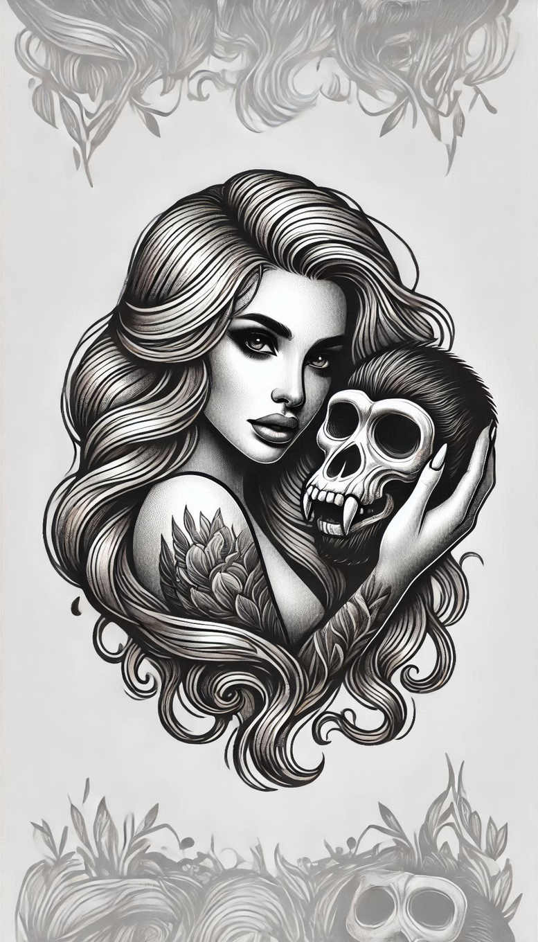 This black and grey tattoo design presents a portrait of a woman cradling a human skull, framed by flowing hair and stylized floral accents. Executed in a refined fine line technique, the piece emphasizes clean line work, subtle shading, and high-contrast details that translate well to larger canvases or as a meaningful smaller tattoo. The central figure’s gaze conveys a sense of resolve and mystery, while the skull introduces mortality as a counterpoint to beauty. On the shoulder, stylized petals and leaves wrap around the arm, creating a natural extension that blends portrait realism with botanical ornament. The composition remains balanced by negative space, enabling crisp definition across different skin tones. The upper background features ornamental, almost wallpaper-like motifs that echo the floral theme without overpowering the main subject. This tattoo design is ideal for those seeking a meaningful depiction that combines life and death symbolism with elegant linework; it can be adapted into a range of sizes from small tattoos to larger back or sleeve studies. The piece fits within the black and grey aesthetic, with shading that can be intensified for older skin or faded ink if requested. Because this is an AI-generated tattoo project sample, it showcases modern approaches to illustration and shading that tattooers can interpret in varied styles. The graphic elements—including the skull, flower motifs, and flowing hair—offer clear opportunities for color breaks, micro details, and pattern-like embellishments if a client desires a cover-up-ready redesign. In addition to traditional symbolism, the design nods to Japanese and neo-traditional influences through its composition and line economy, remaining flexible for customization as a tattoo design, a meaningful tattoo for anniversaries or personal milestones, and a striking representation of black and grey ink artistry. Potential clients might consider it for small tattoos or larger projects such as chest or forearm pieces, where the interplay of dark shadows and fine lines creates a timeless body art statement. Keywords embedded include tattoo, tattoo design, meaningful tattoos, fine line tattoo, lotus flower tattoo, infinity tattoo, tribal tattoo, rose tattoo design, small tattoos, flower tattoos, custom tattoo design, Japanese style tattoo, black and grey, realistic tattoo, body art, ink. If a cover-up is needed, the contrast between the skull and the surrounding floral elements makes it adaptable for covering old ink with a fresh, cinematic look.