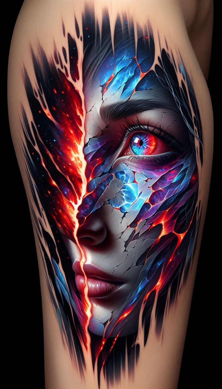 This concept presents a striking cracked mosaic portrait rendered in full color, merging painterly realism with graphic breakage. The central visage is carved from fractured shards of pigment—lava red fissures traversing one cheek and jaw while electric blue and violet shards creep across the other side—creating a dynamic tension between destruction and renewal. An intense neon eye anchors the composition, its iris blazing with pink and cyan highlights that read as life within the ruined mask. The surrounding skin tone is pale and smooth, contrasted by jagged edges of color that peel away toward the margins, evoking the impression of a surface rupture. Executed in a high-contrast, digital-paint approach, the piece relies on layered shading, crisp edge definition, and careful color blocking to achieve a lifelike, almost three-dimensional effect on the skin. Although this is a contemporary concept, the design nods to classic bio-mechanical and geometric mosaic aesthetics, while maintaining a strong narrative of transformation—crack opens, light pours through, and the subject remains present beneath the fracture. As an AI-generated tattoo project, it demonstrates how a cover-up idea can leverage dark negative space and vivid color to reinterpret an earlier mark into something bold and meaningful. The piece can be adapted as a large sleeve or leg work, with the mosaic shards flowing along curves to maximize the body’s natural contours. In terms of technique, expect smooth gradient transitions between shards, precise edge definition, and a mix of cool blues with warm reds to guide the viewer’s eye. This description intentionally weaves into search-friendly terms such as tattoo design, meaningful tattoos, fine line tattoo, black and grey, realistic tattoo, body art, and ink; while this particular piece is rendered in full color, the concept can be adjusted to suit a cover-up strategy. The mosaic pattern is a hallmark of the composition, offering bold visual impact and a versatile canvas for a cover-up tattoo project.
