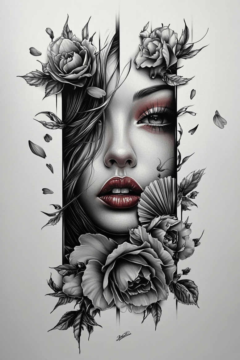This piece presents a realistic grayscale portrait fused with floral motifs, designed as a versatile tattoo concept suitable for a refined cover-up when needed. The composition centers on a female face shaded with precise gradients, framed by large roses whose petals and leaves thread through narrow vertical panels. The high-contrast black and grey ink against a pale background creates a bold silhouette that reads clearly from a distance yet rewards close inspection with intricate line work, stippling, and subtle skin-tone gradations. The technique emphasizes fine line precision, controlled shading, and smooth tonal gradation to convey skin texture, glossy lips, and petal curvature, while the patterning adds a graphic reading that remains timeless. The roses symbolize beauty, resilience, and renewal, while the portrait introduces identity, memory, or tribute as a personal meaning—making the design adaptable to meaningful tattoos or commemorative ink. The split-panel layout nods to contemporary graphic styles and Japanese-inspired tattoo aesthetics, while the floral motif provides a flexible canvas for variations in size and placement, from small forearm pieces to larger back or chest pieces. For cover-up potential, the density of dark regions can be leveraged to conceal existing ink, with options to adjust panel alignment, scale, or petal density to fit skin tone, scar texture, and anatomy. As an AI-generated tattoo project, this concept offers a modern starting point that can be customized in line weight, petal density, and overall scale to suit individual shoppers’ preferences and body curves. It is poised to rank in editorial and search contexts for tattoo design, meaningful tattoos, fine line tattoo, rose tattoo design, black and grey, realistic tattoo, and body art, while delivering a striking, pattern-rich motif that remains legible as a long-term body art statement.