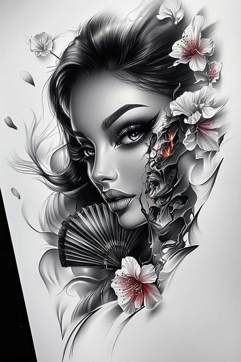 This AI-generated tattoo project presents a refined black-and-grey portrait that anchors the composition with a poised female face. The gaze and lips are rendered with soft gradients and precise line work that convey realism, while the hair flows in sweeping strokes that frame the central motif. Surrounding the face are flowers that flutter along the cheek and temple, balancing the gravity of the portrait with organic lightness. A folded hand fan adds decorative texture, its lines echoing the shading of the skin and hair. On the right side the image reveals a fractured, graphic pattern that resembles cracked stone merging with a skull-like silhouette; this element transitions into petals, creating a seamless fusion of body-art symbolism and ornamental design. The overall palette remains black and grey, with a subtle red accent in the eye area to heighten drama. Techniques emphasize smooth tonal transitions, cross-hatching for texture, and controlled negative space to ensure readability on skin. The piece reads as a narrative—beauty, strength, and transformation—making it suitable for prominent placement on the shoulder blade, upper arm, back, or chest, and particularly strong as a cover-up where dense shading can disguise prior work. For collectors seeking meaningful tattoos, this concept showcases how floral motifs can partner with a realistic portrait and a graphic pattern to form a cohesive custom tattoo design, while staying adaptable to variations in size, line density, and placement; it aligns with current trends in tattoo, meaning tattoos, fine line tattoo, flower tattoos, black and grey, realistic tattoo, body art, ink.