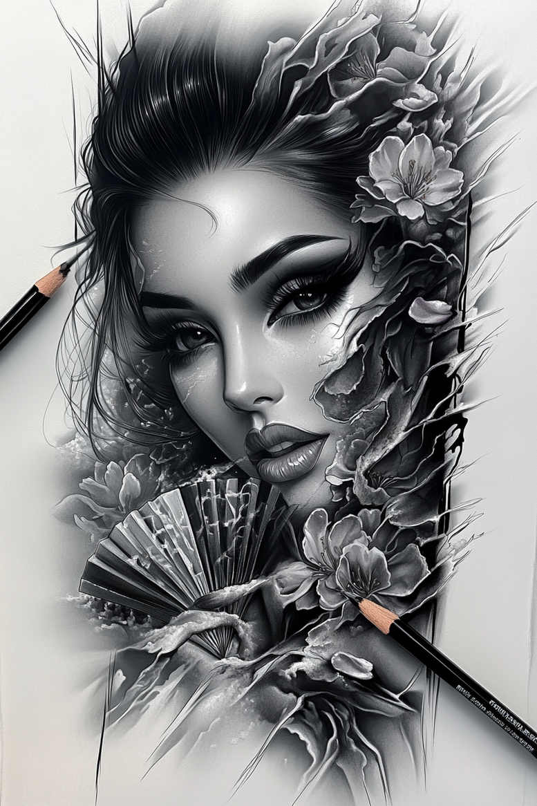 AI-generated tattoo project presents a breathtaking black and grey portrait that blends a serene female visage with an organic bouquet of blossoms and a decorative fan. The composition is anchored by a smooth, hyper-real shading technique that creates luminous skin tones, strong contouring of the eyes, nose, and lips, and a brushwork-like rendering of the petals that drift along the temple and jawline. The right side of the piece blooms with floral clusters, while a classic hand fan sits near the lower left, providing a geometric counterpoint to the organic forms. Subtle crackle textures and soft highlights add depth, giving the image the feel of a high-contrast, refined realism that translates well to skin. The pencil hovers at the edges as if part of a master study, emphasizing the draftsmanship behind the design. From a technical standpoint, the piece showcases careful line weight variation, delicate shading, and controlled negative space to accommodate the curves of the body. The symbolism combines beauty, introspection, and grace: the flowers suggest renewal, the fan hints at mystery, and the monochrome palette ensures longevity on aging skin. As an AI-generated tattoo project, this design is ready to be adapted to individual commissions, with potential adjustments for scale, placement, and cleanup lines. For tattoo enthusiasts seeking meaningful tattoos, this black and grey portrait with floral accents doubles as a sophisticated cover-up option due to its bold shadows and dense negative space; the recipe is ideal for a real-world, custom tattoo design that respects anatomy while delivering a striking statement in ink. It nods to modern realism and traditional botanical motifs, appealing to aficionados of fine line tattoo techniques, flower tattoos, and portraits, and it offers practical versatility for Japanese style tattoo influences and black and grey ink lovers alike.