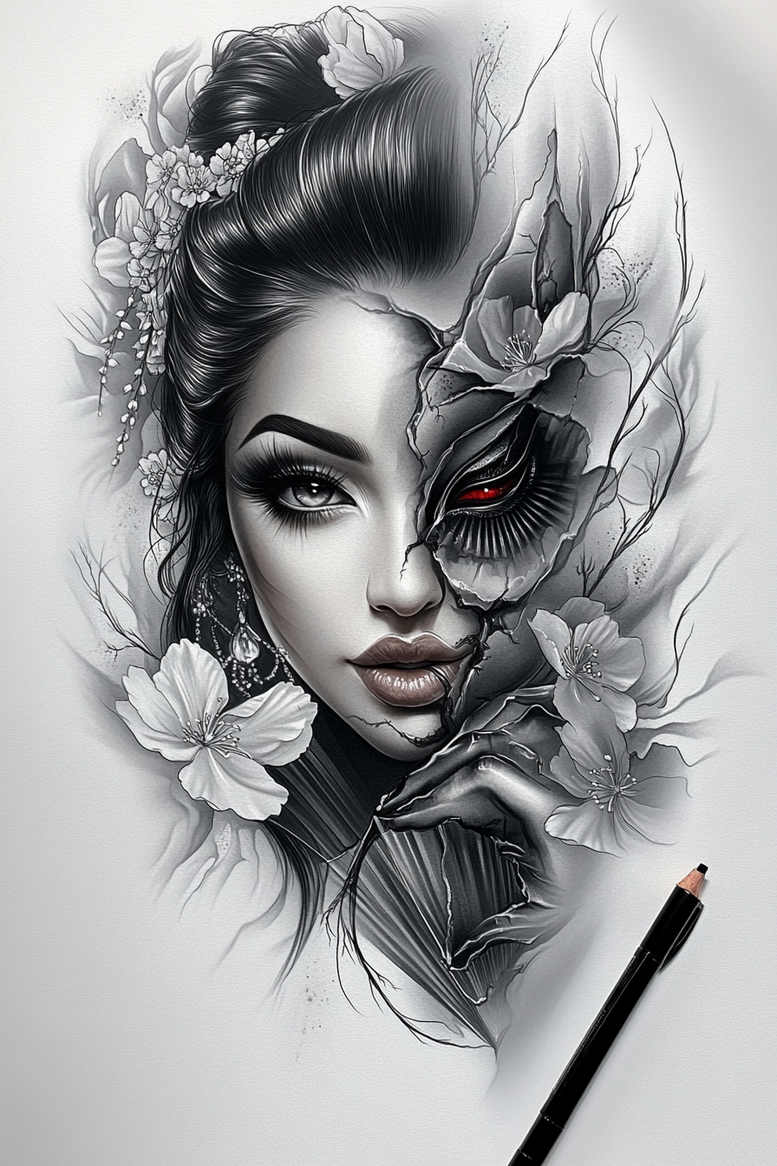 An AI-generated, hyper-realistic grayscale tattoo concept that merges portraiture with botanical fragmentation. The left side of the face remains smooth and lifelike, while the right half dissolves into a cracked, porcelain mask that fractures into blossoms and branches. Flowers weave through the hair and surrounding skin, creating a soft counterpoint to the stark lines of the fracture. A single red eye pierces the monochrome, serving as a focal point that draws the viewer into the tension between beauty and decay. A pencil rests along the lower edge of the composition, hinting at the artist’s hand and the design’s genesis. The shading is meticulously controlled, using fine line work and smooth gradients to render realistic skin tones, lock of hair, and petals in black and grey. The concept explores duality: resilience and fragility, transformation and renewal, with the flowers symbolizing growth emerging from fracture. The work reads like a contemporary tattoo design that can be scaled to a large piece on the shoulder or back, or adapted for a smaller, high-contrast sleeve tattoo. Because the piece relies on deep contrast and layered linework, it is especially suitable as a cover-up, capable of concealing prior tattoos while delivering an impactful new narrative. As an AI-origin concept, it demonstrates how machine-generated ideas can inspire live tattoo projects, while remaining rooted in classic motifs such as floral symbolism, realism, and subtle negative space. This description threads keywords naturally—tattoo, tattoo design, meaningful tattoos, fine line tattoo, lotus flower tattoo, infinity tattoo, tribal tattoo, rose tattoo design, small tattoos, flower tattoos, custom tattoo design, Japanese style tattoo, black and grey, realistic tattoo, body art, ink—making it suitable for portfolios and wellness-focused audiences seeking a bold, meaningful piece.
