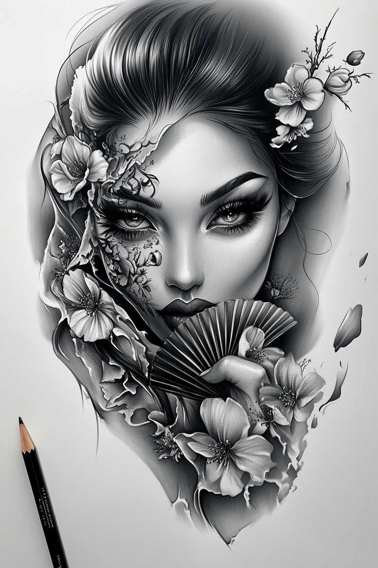 This AI-generated tattoo project presents a cover-up-friendly grayscale portrait that merges a woman’s face with floral motifs and a decorative fan, executed in a refined fine-line technique. The composition centers on a lifelike visage, its eyes and lips defined by crisp line work while the surrounding blossoms and curling vines serve as a flowing frame that integrates into the portrait, offering ample room for shading and concealment of existing ink. Black ink anchors the hair and the fan’s ridges, while midtone greys sculpt the cheek and petals, producing a realistic texture that translates well to skin. The design relies on contrast and negative space to enhance readability on different body areas, and the floral elements function as an ornate pattern that can be scaled or modified to suit a cover-up of larger or darker tattoos. As an AI-generated concept, it illustrates how modern grayscale body art can convey mood and meaning through a combination of strength and vulnerability. The motif speaks to themes of transformation and beauty, with the blossoms representing growth and resilience, and the fan suggesting poise and control. For clients seeking a meaningful tattoo, this piece offers a compelling option within tattoo design libraries: meaningful tattoos, fine line tattoo, black and grey, flower tattoos, custom tattoo design, realistic tattoo, body art, ink. Though intensely dark in tone, it remains adaptable for cover-up applications by adjusting the density of shading and the size of the floral frame, ensuring a seamless integration with surrounding ink.
