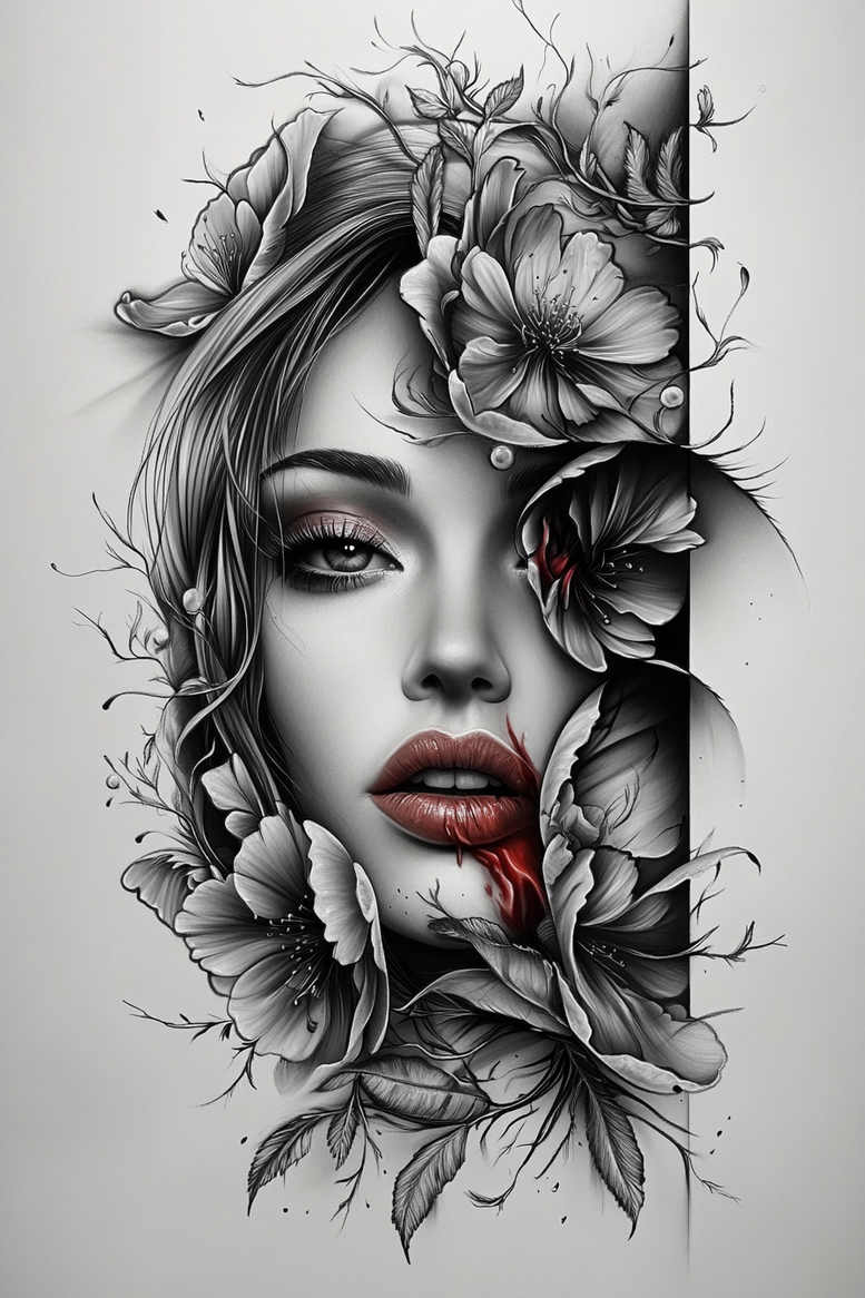 This is an AI-generated tattoo project concept presenting a realistic black and grey floral portrait. The composition centers on a woman’s face, rendered with precise shading and a calm, introspective gaze, while bold blossoms and twisting leaves weave around the features. Fine line details define hair strands and the curve of the lips, balanced by deep blacks and smooth gray gradients that create a lifelike skin tone and convincing depth. A restrained splash of red on the lips provides a dramatic focal point within the monochrome palette. The floral elements form a cohesive pattern that wraps the portrait, offering movement and coherence for potential sleeve or chest work. Symbolically, flowers signify growth and renewal, while the portrait anchors personal meaning in memory or aspiration. The design blends realism with botanical flourish, appealing to both black and grey tattoo aesthetics and fine line tattoo techniques, and aligning with trends in flower tattoos, small tattoos, and custom tattoo design. As a versatile, adjustable concept, the cluster can be resized or rearranged to suit the client’s canvas, whether on forearm, back, or shoulder, and it can be extended with lotus flower tattoo motifs, infinity tattoo echoes, or tribal hints, depending on the narrative. The piece emphasizes controlled shading and line work to read clearly at small scales yet maintain impact at larger sizes, making it well-suited for cover-ups on existing ink; its dense dark elements provide coverage while allowing a refined floral overlay to emerge. This is an AI-generated tattoo project concept, underscoring the evolving role of digital previews in preparing meaningful tattoos, including possible Japanese style tattoo inspiration and rose tattoo design cues, while remaining versatile for body art and ink applications.
