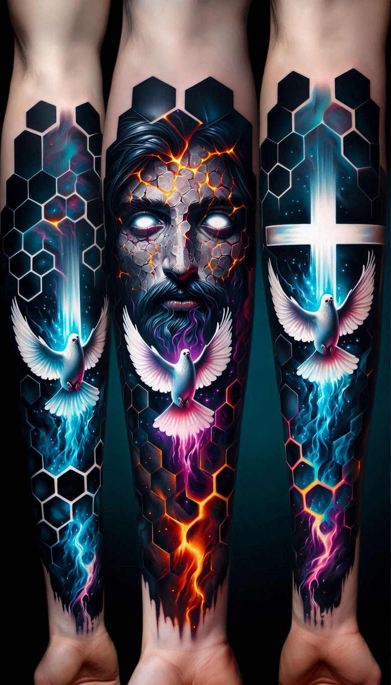 Presented as an AI-generated tattoo project, this triple-arm sleeve concept fuses a central cracked-face portrait with radiant energy, hexagonal honeycomb panels, and three doves in flight. The face shows fractured stone texture with glowing orange fissures and white eyes, while electric blue and violet flames weave along the forearm, creating a dramatic flow from wrist to elbow. Surrounding the central image, geometric hexagon panels coil around each limb, forming a continuous pattern that anchors the composition and intensifies the graphic language. On the right forearm a luminous cross stands against a night-sky backdrop of deep blues, adding a spiritual counterpoint to the fiery center. The color palette is saturated and luminous, with bold blues, pinks, and oranges contrasted by dense black shadows and subtle grey shading that give a painterly yet razor-sharp realism to the skin. The doves, rendered with smooth gradients and crisp white highlights, appear to rise from the energy stream, suggesting themes of renewal, peace, and faith, while the cracked-face motif hints at resilience and rebirth. The piece blends realistic shading with graphic geometry, employing fine line work in the outlines and broad color fields to maximize legibility on forearm canvases. This tattoo design is particularly well-suited for a cover-up because the dark shading and layered shapes can mask older ink while still preserving the new narrative. Note that this is an AI-generated tattoo project, illustrating how generative tools can help clients visualize bold ideas before commissioning a custom tattoo design. While the concept nods to Japanese-style precision and modern patterning, it remains adaptable to different arm sizes, skin tones, and line preferences. Keywords included: tattoo, tattoo design, meaningful tattoos, fine line tattoo, lotus flower tattoo, infinity tattoo, tribal tattoo, rose tattoo design, small tattoos, flower tattoos, custom tattoo design, Japanese style tattoo, black and grey, realistic tattoo, body art, ink, pattern.