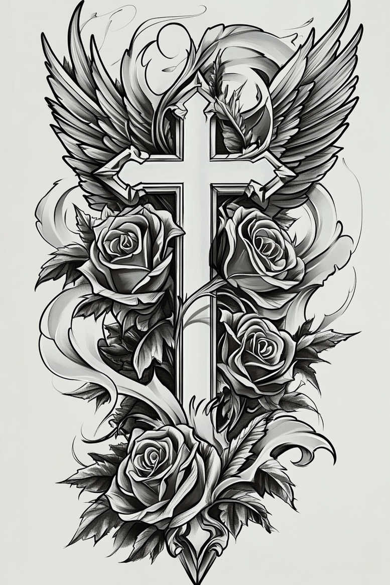 An evocative grayscale tattoo composition centers a tall cross, flanked by wings and interwoven roses. The design relies on high-contrast black-and-grey shading to create depth, with crisp outlines around the cross and smooth transitions in the feathered wings and petal textures. The cross stands as the anchor, its edges bold against a field of soft shadows while the wings unfurl behind it in layered plumes that suggest ascent and protection. Around the vertical shaft, roses twist and bloom, their petals rendered with meticulous gradation from bright white highlights to rich graphite tones, giving them a velvety realism. Delicate swirls and ribbon-like accents weave through the composition, guiding the eye from the base upward toward the crown and lending a sense of movement to an otherwise architectural motif. This tattoo design balances spiritual symbolism with botanical elegance, making it well suited for larger canvases such as the chest, back, or sleeve, yet adaptable to a single-visit piece on a shoulder or forearm. The technique emphasizes precise linework, bold contrasts, and subtle shading to achieve a timeless black-and-grey aesthetic that remains legible over time. In terms of meaning, the cross conveys faith, memorial intent, or personal significance, while the wings symbolize protection and divine ascent and the roses signify love, memory, and renewal. For artists and clients, this serves as a strong reference in a custom tattoo design workflow, offering a versatile motif that can be colorized if desired or extended into a larger composition. This is an AI-generated tattoo project, designed to function as a high-quality starting point for studios seeking a classic cross-and-roses motif with winged adornments and refined shading, capable of being adapted to a variety of placements and scales. It nods to traditional blackwork and realism, balancing bold linework with soft gradations to ensure longevity and timeless appeal in body art.